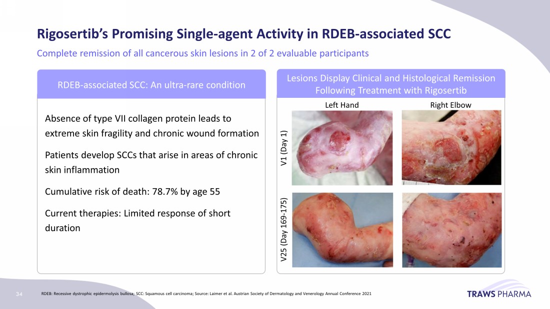 Rigosertib’s Promising Single - agent Activity in RDEB - associated SCC Complete remission of all cancerous skin lesions in 2 of 2 evaluable participants RDEB: Recessive dystrophic epidermolysis bullosa; SCC: Squamous cell carcinoma; Source: Laimer et al. Austrian Society of Dermatology and Venerology Annual Conference 2021 Left Hand Right Elbow V1 (Day 1) V25 (Day 169 - 175) Lesions Display Clinical and Histological Remission Following Treatment with Rigosertib RDEB - associated SCC: An ultra - rare condition Absence of type VII collagen protein leads to extreme skin fragility and chronic wound formation Patients develop SCCs that arise in areas of chronic skin inflammation Cumulative risk of death: 78.7% by age 55 Current therapies: Limited response of short duration 34