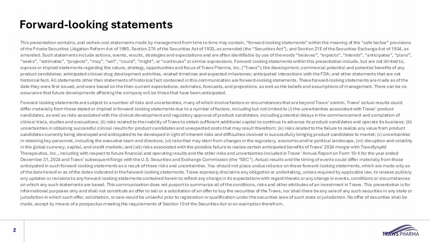 Forward - looking statements 2  This presentation contains, and certain oral statements made by management from time to time may contain, “forward - looking state ments” within the meaning of the “safe harbor” provisions of the Private Securities Litigation Reform Act of 1995, Section 27A of the Securities Act of 1933, as amended (the “Securiti es Act”), and Section 21E of the Securities Exchange Act of 1934, as amended. Such statements include actions, events, results, strategies and expectations and are often identifiable by use of t he words “believes”, “expects”, “intends”, “anticipates”, “plans”, “seeks”, “estimates”, “projects”, “may”, “will”, “could”, “might”, or “continues” or similar expressions. Forward - looking statem ents within this presentation include, but are not limited to, express or implied statements regarding the nature, strategy, opportunities and focus of Traws Pharma, Inc. (“Traws”); the de vel opment, commercial potential and potential benefits of any product candidates; anticipated clinical drug development activities, related timelines and expected milestones; anticipated int eractions with the FDA; and other statements that are not historical fact. All statements other than statements of historical fact contained in this communication are forward - looking sta tements. These forward - looking statements are made as of the date they were first issued, and were based on the then - current expectations, estimates, forecasts, and projections, as well as the beliefs and assumptions of management. There can be no assurance that future developments affecting the company will be those that have been anticipated. Forward - looking statements are subject to a number of risks and uncertainties, many of which involve factors or circumstances th at are beyond Traws’ control. Traws’ actual results could differ materially from those stated or implied in forward - looking statements due to a number of factors, including but not limit ed to (i) the uncertainties associated with Traws’ product candidates, as well as risks associated with the clinical development and regulatory approval of product candidates, includin g p otential delays in the commencement and completion of clinical trials, studies and evaluations; (ii) risks related to the inability of Traws to obtain sufficient additional capita l t o continue to advance its product candidates and operate its business; (iii) uncertainties in obtaining successful clinical results for product candidates and unexpected costs that may result therefrom; (i v) risks related to the failure to realize any value from product candidates currently being developed and anticipated to be developed in light of inherent risks and difficulties involved in suc cessfully bringing product candidates to market; (v) uncertainties in retaining key personnel, including the executive team and directors; (vi) risks that may stem from changes in the regulato ry, economic and/or political landscape, (vii) disruption and volatility in the global currency, capital, and credit markets; and (viii) risks associated with the possible failure to realize certain an ticipated benefits of Traws’ 2024 merger with Trawsfynydd Therapeutics, Inc., including with respect to future financial and operating results and the other risks and uncertainties in clu ded in Traws’ Annual Report on Form 10 - K for the year ended December 31, 2024 and Traws’ subsequent filings with the U.S. Securities and Exchange Commission (the “SEC”). Actual results and the timing of events could differ materially from those anticipated in such forward - looking statements as a result of these risks and uncertainties. You should not place undue reliance on these forward - looking statements, which are made only as of the date hereof or as of the dates indicated in the forward - looking statements. Traws expressly disclaims any obligation or u ndertaking, unless required by applicable law, to release publicly any updates or revisions to any forward - looking statements contained herein to reflect any change in its expectations with regar d thereto or any change in events, conditions or circumstances on which any such statements are based. This communication does not purport to summarize all of the conditions, risks and oth er attributes of an investment in Traws. This presentation is for informational purposes only and shall not constitute an offer to sell or a solicitation of an offer to buy the securities of the Traws, nor shall there be any sale of any such securities in any state or jurisdiction in which such offer, solicitation, or sale would be unlawful prior to registration or qualification under the se cur ities laws of such state or jurisdiction. No offer of securities shall be made, except by means of a prospectus meeting the requirements of Section 10 of the Securities Act or an exemption therefrom.