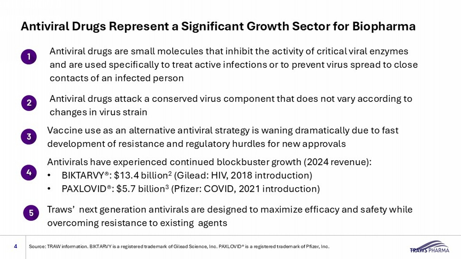 4 Antiviral drugs attack a conserved virus component that does not vary according to changes in virus strain Antiviral drugs are small molecules that inhibit the activity of critical viral enzymes and are used specifically to treat active infections or to prevent virus spread to close contacts of an infected person Source: TRAW information. BIKTARVY is a registered trademark of Gilead Science, Inc. PAXLOVID® is a registered trademark of P fiz er, Inc. 5 Antiviral Drugs Represent a Significant Growth Sector for Biopharma V accine use as an alternative antiviral strategy is waning dramatically due to fast development of resistance and regulatory hurdles for new approvals Antivirals have experienced continued blockbuster growth (2024 revenue): • BIKTARVY®: $13.4 billion 2 (Gilead: HIV, 2018 introduction) • PAXLOVID®: $5.7 billion 3 (Pfizer: COVID, 2021 introduction) Traws’ next generation antivirals are designed to maximize efficacy and safety while overcoming resistance to existing agents