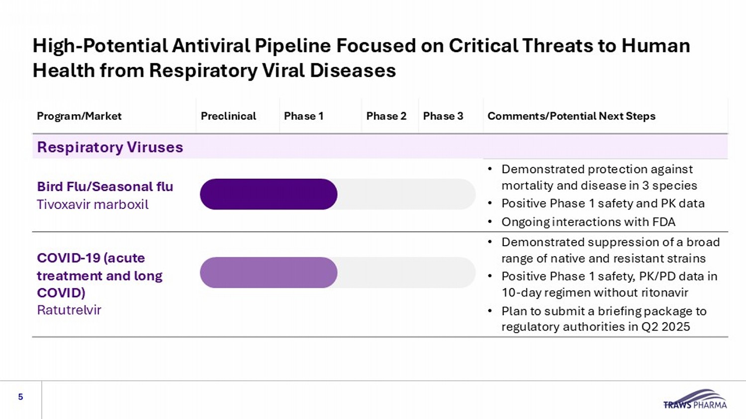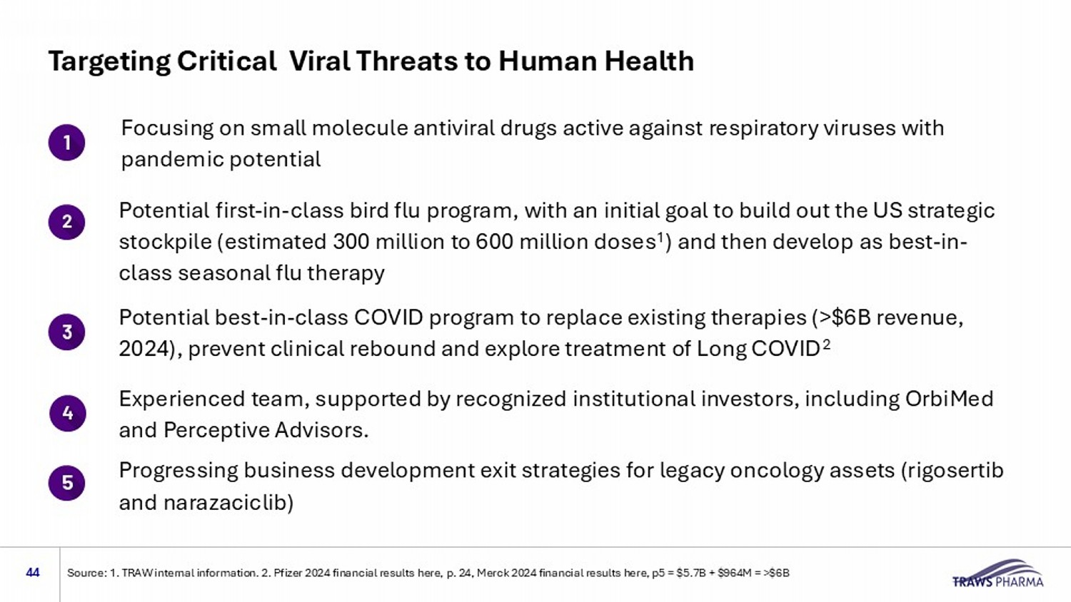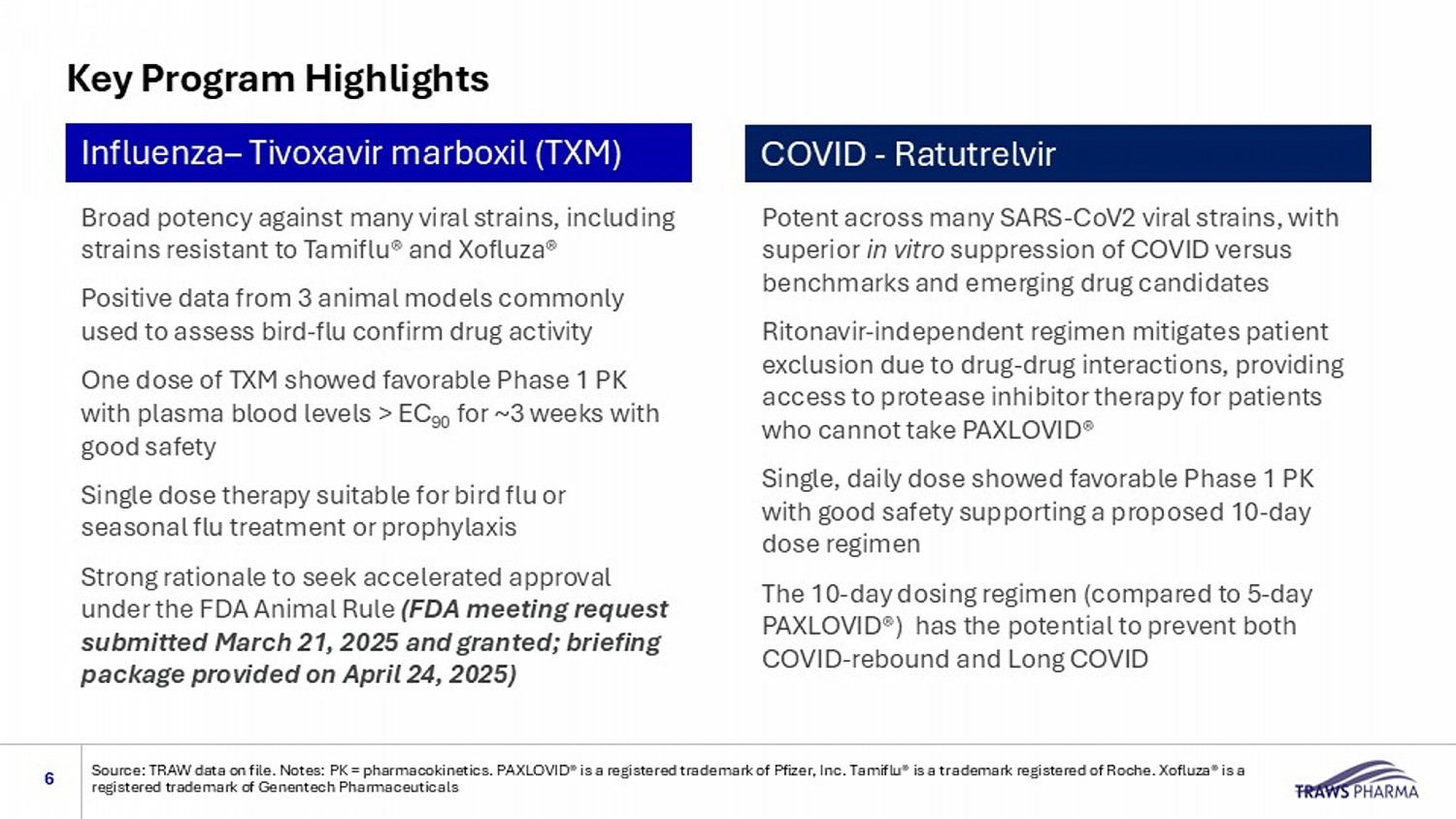 Targeting Critical Viral Threats to Human Health 3 Potential first - in - class bird flu program , with an initial goal to build out the US strategic stockpile (estimated 300 million to 600 million doses 1 ) and then develop as best - in - class seasonal flu therapy Potential best - in - class COVID program to replace existing therapies (>$6B revenue, 2024), prevent clinical rebound and explore treatment of Long COVID 2 4 5 F ocusing on small molecule antiviral drugs active against respiratory viruses with pandemic potential Experienced team, supported by recognized institutional investors, including OrbiMed and Perceptive Advisors. Progressing business development exit strategies for legacy oncology assets (rigosertib and narazaciclib) Source: 1. TRAW internal information. 2. Pfizer 2024 financial results here, p. 24, Merck 2024 financial results here, p5 = $ 5.7 B + $964M = >$6B