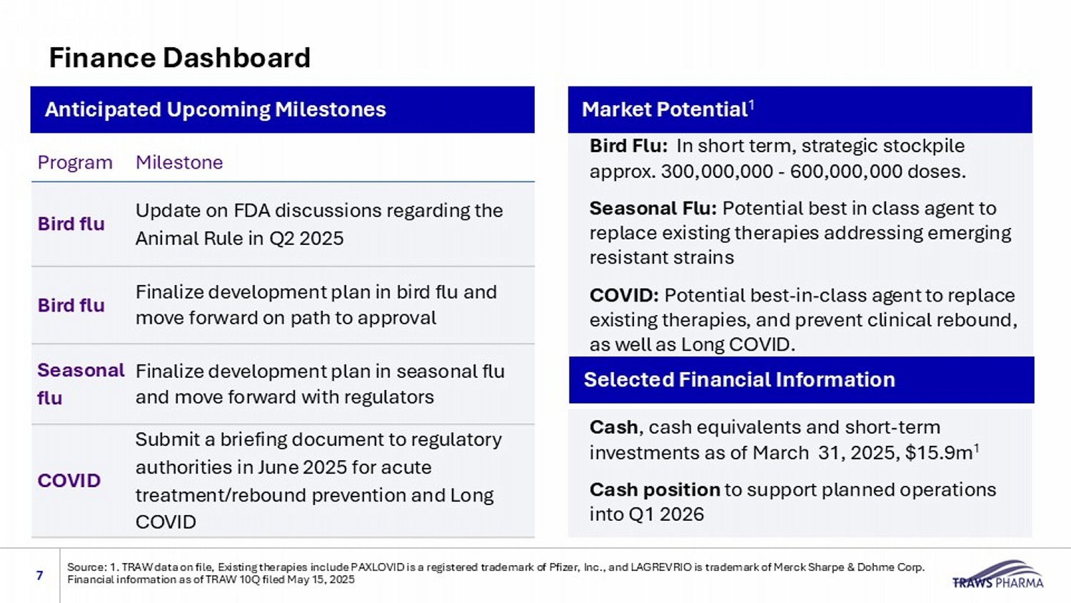 Key Program Highlights 6 Source: TRAW data on file. Notes: PK = pharmacokinetics. PAXLOVID® is a registered trademark of Pfizer, Inc. Tamiflu® is a tr ade mark registered of Roche. Xofluza® is a registered trademark of Genentech Pharmaceuticals Influenza – Tivoxavir marboxil (TXM) COVID - Ratutrelvir Broad potency against many viral strains, including strains resistant to Tamiflu® and Xofluza® Positive data from 3 animal models commonly used to assess bird - flu confirm drug activity One dose of TXM showed favorable Phase 1 PK with plasma blood levels > EC 90 for ~3 weeks with good safety Single dose therapy suitable for bird flu or seasonal flu treatment or prophylaxis Strong rationale to seek accelerated approval under the FDA Animal Rule (FDA meeting request submitted March 21, 2025 and granted; briefing package provided on April 24, 2025) Potent across many SARS - CoV2 viral strains, with superior in vitro suppression of COVID versus benchmarks and emerging drug candidates Ritonavir - independent regimen mitigates patient exclusion due to drug - drug interactions, providing access to protease inhibitor therapy for patients who cannot take PAXLOVID® Single, daily dose showed favorable Phase 1 PK with good safety supporting a proposed 10 - day dose regimen The 10 - day dosing regimen (compared to 5 - day PAXLOVID® ) has the potential to prevent both COVID - rebound and Long COVID