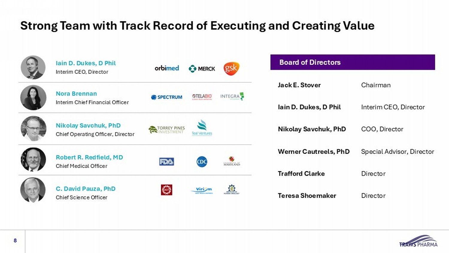 Bird Flu: In short term, strategic stockpile approx. 300,000,000 - 600,000,000 doses . Seasonal Flu: Potential best in class agent to replace existing therapies addressing emerging resistant strains COVID: Potential b est - in - class agent to replace existing therapies, and prevent clinical rebound, as well as Long COVID. Cash , cash equivalents and short - term investments as of March 31, 2025, $15.9m 1 Cash position to support planned operations into Q1 2026 Selected Financial Information Anticipated Upcoming Milestones Milestone Program Update on FDA discussions regarding the Animal Rule in Q2 2025 Bird flu Finalize development plan in bird flu and move forward on path to approval Bird flu Finalize development plan in seasonal flu and move forward with regulators Seasonal flu Submit a briefing document to regulatory authorities in June 2025 for acute treatment/rebound prevention and Long COVID COVID Finance Dashboard Source: 1. TRAW data on file, Existing therapies include PAXLOVID is a registered trademark of Pfizer, Inc., and LAGREVRIO is tr ademark of Merck Sharpe & Dohme Corp. Financial information as of TRAW 10Q filed May 15, 2025 Market Potential 1 7