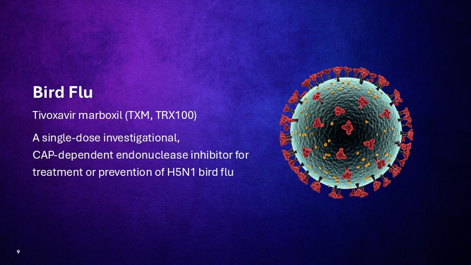 Bird Flu Tivoxavir marboxil (TXM, TRX100) A single - dose investigational, CAP - dependent endonuclease inhibitor for treatment or prevention of H5N1 bird flu 9