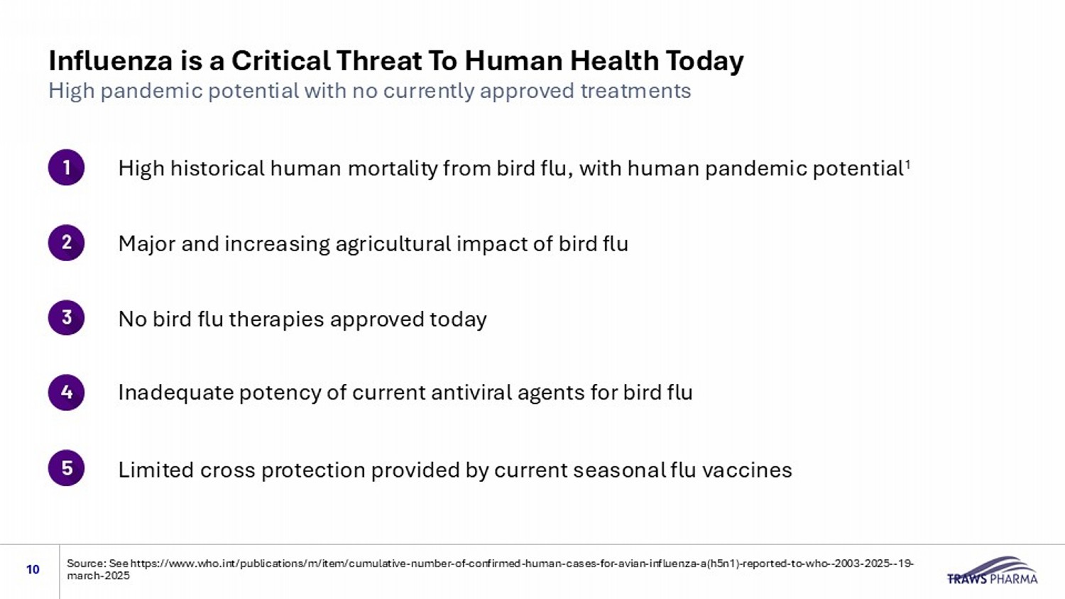 Influenza is a Critical Threat To Human Health Today High pandemic potential with no currently approved treatments 10 Major and increasing agricultural impact of bird flu No bird flu therapies approved today 4 5 High historical human mortality from bird flu, with human pandemic potential 1 L imited cross protection provided by current seasonal flu vaccines Inadequate potency of current antiviral agents for bird flu Source: See https://www.who.int/publications/m/item/cumulative - number - of - confirmed - human - cases - for - avian - influenza - a(h5n1) - repor ted - to - who -- 2003 - 2025 -- 19 - march - 2025
