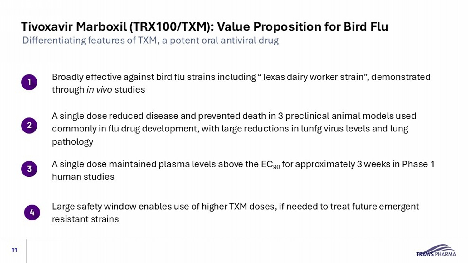 Tivoxavir Marboxil (TRX100/TXM): Value Proposition for Bird Flu 11 Differentiating features of TXM, a potent oral antiviral drug A single dose reduced disease and prevented death in 3 preclinical animal models used commonly in flu drug development, with large reductions in lunf g virus levels and lung pathology A singl e dose maintained plasma levels above the EC 90 for approximately 3 weeks in Phase 1 human studies 4 5 Broadly effective against bird flu strains including “Texas dairy worker strain”, demonstrated through in vivo studies Large safety window enables use of higher TXM doses, if needed to treat future emergent resistant strains