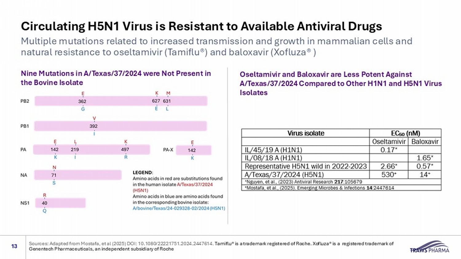 Circulating H5N1 Virus is Resistant to Available Antiviral Drugs Multiple mutations related to increased transmission and growth in mammalian cells and natural resistance to oseltamivir (Tamiflu®) and baloxavir (Xofluza® ) 13 Nine Mutations in A/Texas/37/2024 were Not Present in the Bovine Isolate Oseltamivir and Baloxavir are Less Potent Against A/Texas/37/2024 Compared to Other H1N1 and H5N1 Virus Isolates Sources: Adapted from Mostafa, et al (2025) DOI: 10.1080/22221751.2024.2447614. Tamiflu® is a trademark registered of Roche. Xofluza® is a registered trademark of Genentech Pharmaceuticals, an independent subsidiary of Roche