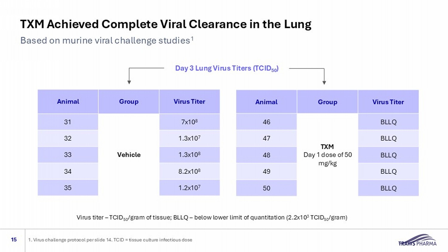 Mouse antiviral study using bird flu (H5N1) transmitted from cattle to a dairy worker 14 Notes: Challenge dose via intranasal delivery. TXM = tivoxavir marboxil, 5 animals per group sacrificed on D3 for determinati on of virus titer in lungs (data pending). Data on file, TRAWS Pharma. Virus Challenge Protocol Virus stock: H5N1(A/Texas/37/2024) Stock titer: 1.47x10 9 TCID 50 /mL Challenge dose: 7.34x10 0 TCID 50 /dose Oral TVX: Dosed 0 and 12 hours after challenge (total 50 mg/kg – equivalent to 240 mg in human) Two Groups: 15 animals per group Bird Flu Human isolate H5N1 intranasal Oral dose TRX100 TXM Provides 100% Protection Against Lethal Bird Flu Challenge in Mice