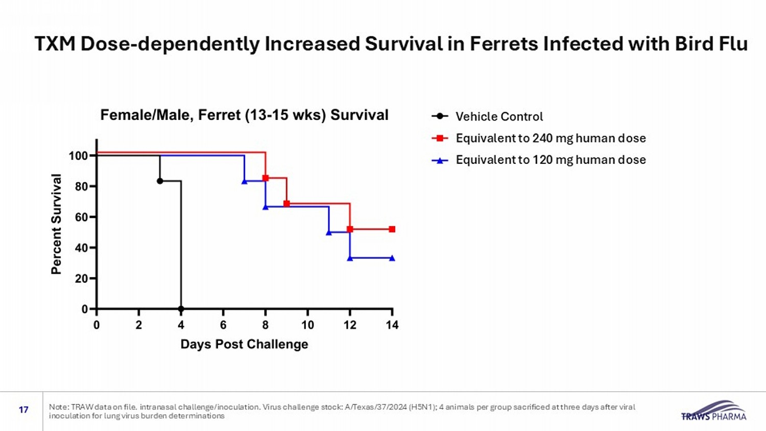 Virus Challenge Study in Ferrets: Key Data to Support Clinical and Regulatory Strategy for TXM in Bird Flu 16 Note: TRAW data on file. intranasal challenge/inoculation. Virus challenge stock: A/Texas/37/2024 (H5N1); 4 animals per group sa crificed at three days after viral inoculation for lung virus burden determinations Oral treatment: 8 hours after virus inoculation Doses: 120 mg human equivalent 240 mg in human equivalent Two Groups: 10 Animals per group (5F/5M), 13 - 15 weeks of age Treated and control Endpoints: Survival, changes in body weight, virus burden in lung and nasal tissues Topline Data: Substantial improvements in disease progression observed after a single dose of TXM • Lethal challenge showed that TXM increased the proportion of surviving animals • Lowered the viral burden in lungs and nasal tissues • Delayed and reduced body weight loss Promising topline data in ferret model using virus isolated from a dairy worker. Viral inoculum: 1X10 3 TCID 50 of A/Texas/37/2024 H5N1 via intranasal instillation Ferret model