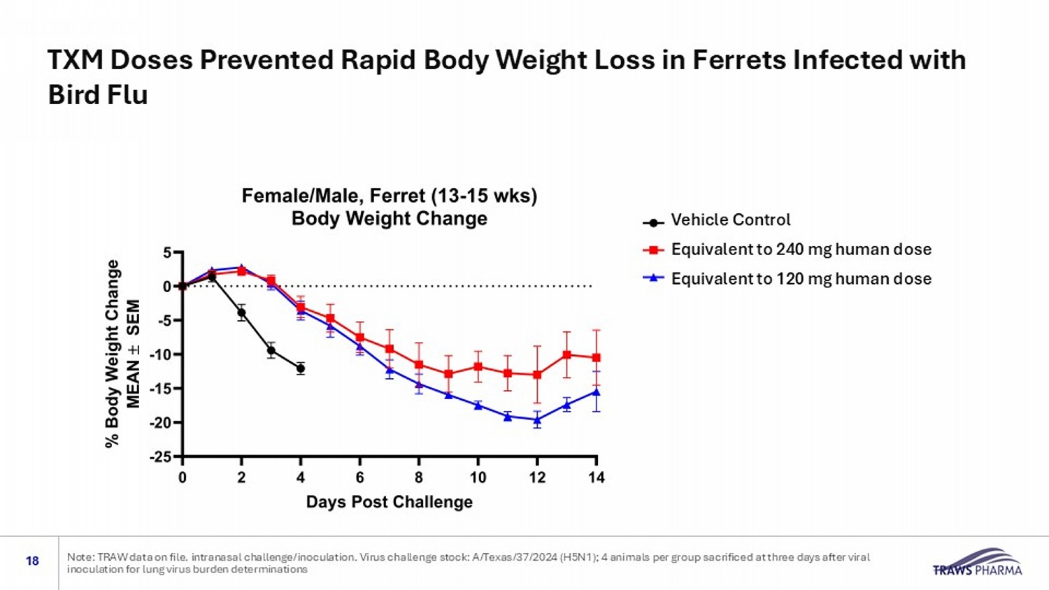 Vehicle Control Equivalent to 240 mg human dose Equivalent to 120 mg human dose TXM Dose - dependently Increased Survival in Ferrets Infected with Bird Flu 17 Note: TRAW data on file. intranasal challenge/inoculation. Virus challenge stock: A/Texas/37/2024 (H5N1); 4 animals per group sa crificed at three days after viral inoculation for lung virus burden determinations