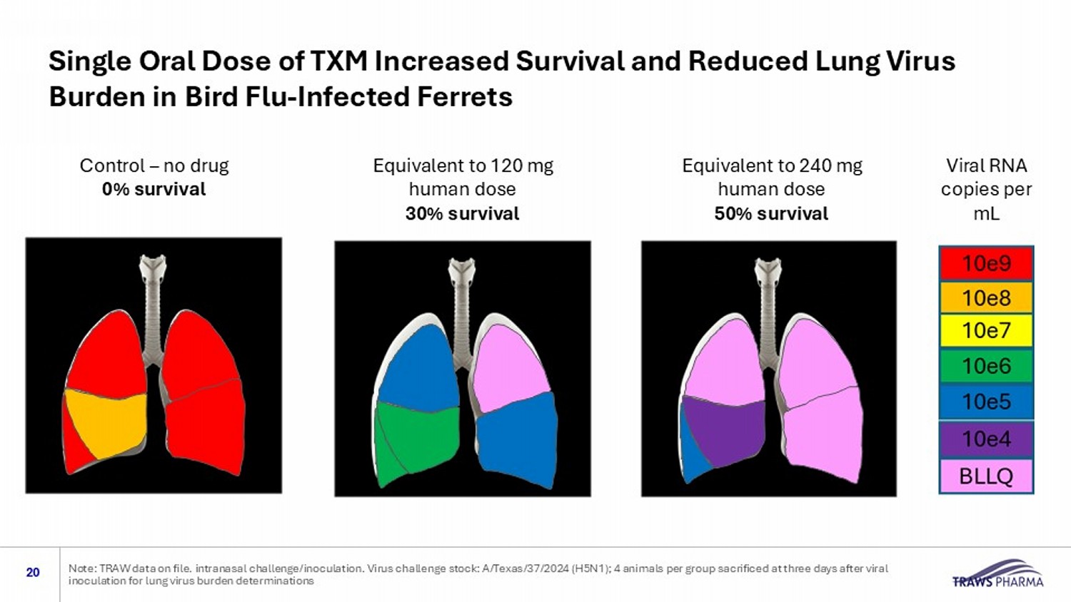 Vehicle Control High dose (equivalent to 240 mg human dose Low dose (equivalent to 120 mg human dose) Vehicle Control Equivalent to 240 mg human dose Equivalent to 120 mg human dose TXM Doses Prevented Rapid Body Weight Loss in Ferrets Infected with Bird Flu 18 Note: TRAW data on file. intranasal challenge/inoculation. Virus challenge stock: A/Texas/37/2024 (H5N1); 4 animals per group sa crificed at three days after viral inoculation for lung virus burden determinations