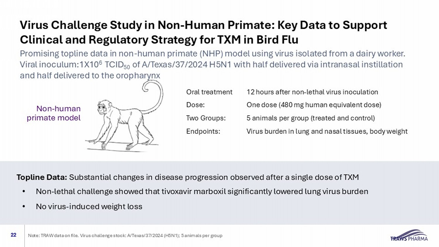 TXM Treatment Reduced Lung Pathology in Ferrets Infected with Bird Flu Virus: Dose - Dependent Impact on Cellular Infiltration of the Lungs 21 Note: TRAW data on file. intranasal infection with A/Texas/37/2024 (H5N1); lung pathology assessed three days after infectio n. Note: 1 = TXM dose of 10.6 mg; 2 = TSM dose of 21.2 mg. HE = human equivalent Day 3: Control Day 3 2 : Human Equivalent 240 mg Day 3 1 : Human Equivalent 120 mg Cellular infiltration/inflammation: basophilic, dark - staining areas (solid arrows ) • Control : Extensive cellular infiltration of lung • TXM 10.6 mg (HE120 mg): Areas of cellular infiltration greater than the 21.2 mg dose animals, far less than untreated controls • TXM 21.2 mg (HE 240 mg): Few areas of cellular infiltration, lung mostly normal with open alveoli