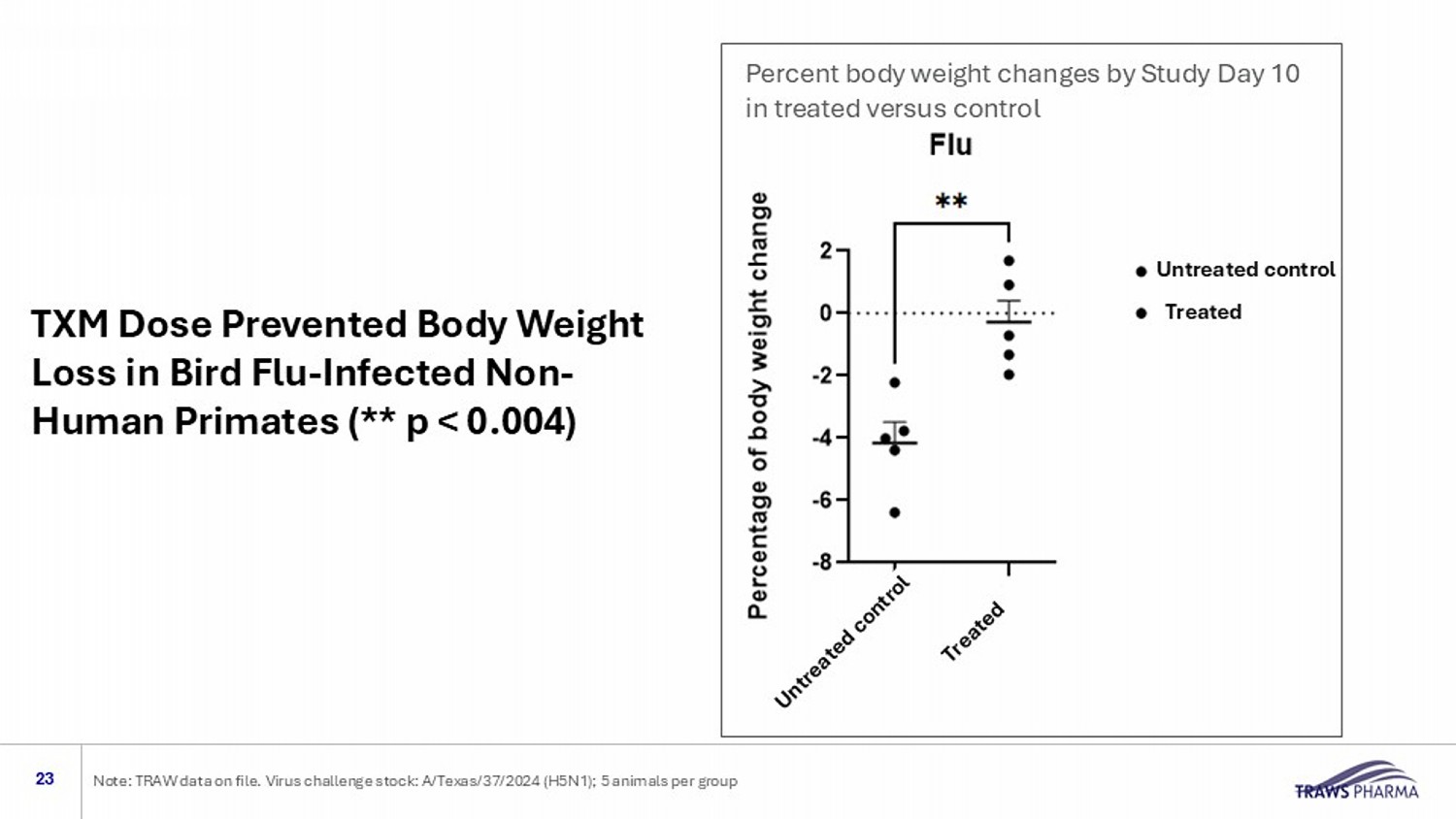Percent body weight changes by Study Day 10 in treated versus control TXM Dose Prevented Body Weight Loss in Bird Flu - Infected Non - Human Primates (** p < 0.004) 23 Note: TRAW data on file. Virus challenge stock: A/Texas/37/2024 (H5N1); 5 animals per group Treated Untreated control
