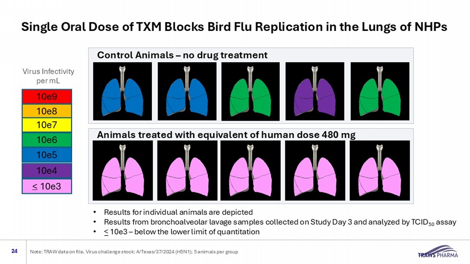 Control Animals – no drug treatment • Results for individual animals are depicted • Results from bronchoalveolar lavage samples collected on Study Day 3 and analyzed by TCID 50 assay • < 10e3 – below the lower limit of quantitation Animals treated with equivalent of human dose 480 mg Virus Infectivity per mL Single Oral Dose of TXM Blocks Bird Flu Replication in the Lungs of NHPs 24 Note: TRAW data on file. Virus challenge stock: A/Texas/37/2024 (H5N1); 5 animals per group