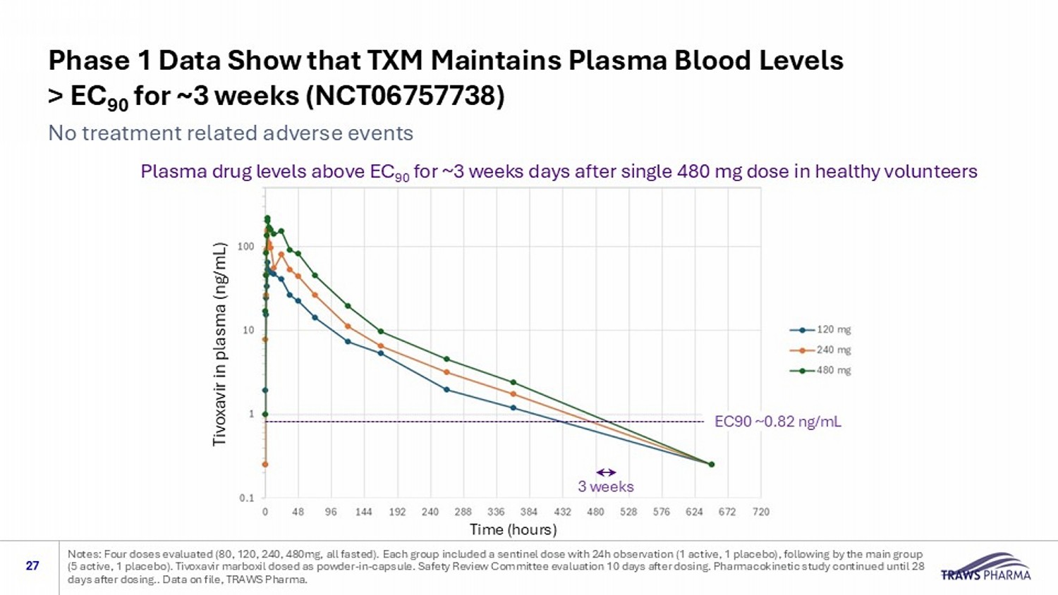 Phase 1 Study Design for TXM 26 Notes: TRAW data on file. Sentinels observed for 24 hours before dosing Main Group. Tivoxavir marboxil dose given as powder - in - c apsule. Safety Review Committee evaluation 10 days after dosing. Pharmacokinetic study continued until 28 days after dosing. Eligibility : Healthy volunteers Flu - negative men and women, ages 18 - 64 years of age Endpoints: Primary: • Safety and tolerability Secondary: • Ability to maintain plasma blood levels above the EC 90 • Pharmacokinetics Treatment 80 mg,120 mg, 240 mg, 480 mg doses • 8 patients/dose (6 active, 2 placebo) per cohort • All cohorts were fasted and included an initial 2 - patient sentinel safety dose (1 active, 1 placebo) Single - dose regimen Assessments • Plasma drug level assessment multiple times over three weeks