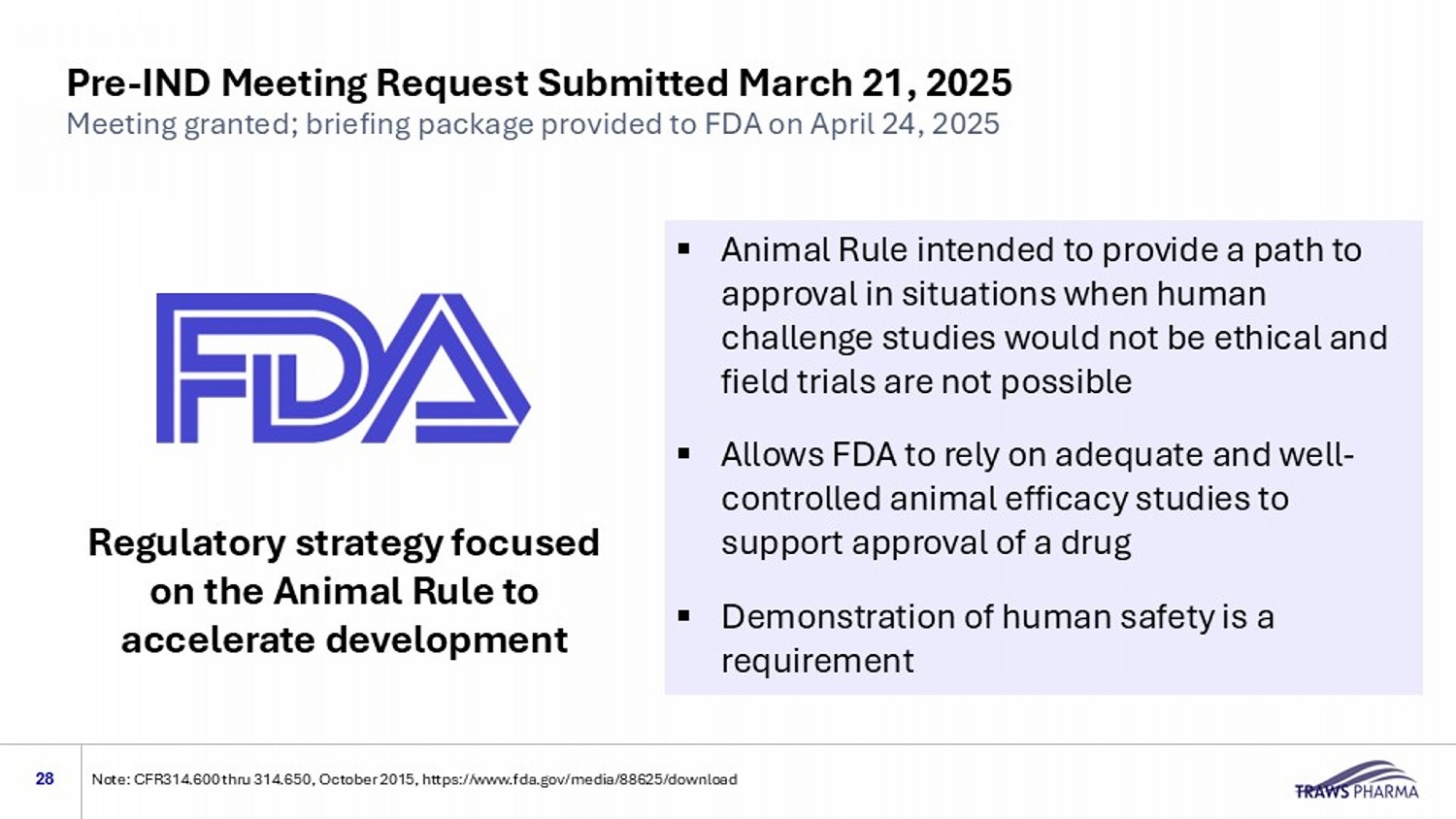 Pre - IND Meeting Request Submitted March 21, 2025 28 Meeting granted; briefing package provided to FDA on April 24, 2025 Note: CFR314.600 thru 314.650 , October 2015 , https://www.fda.gov/media/88625/download Regulatory strategy focused on the Animal Rule to accelerate development ▪ Animal Rule intended to provide a path to approval in situations when human challenge studies would not be ethical and field trials are not possible ▪ Allows FDA to rely on adequate and well - controlled animal efficacy studies to support approval of a drug ▪ Demonstration of human safety is a requirement