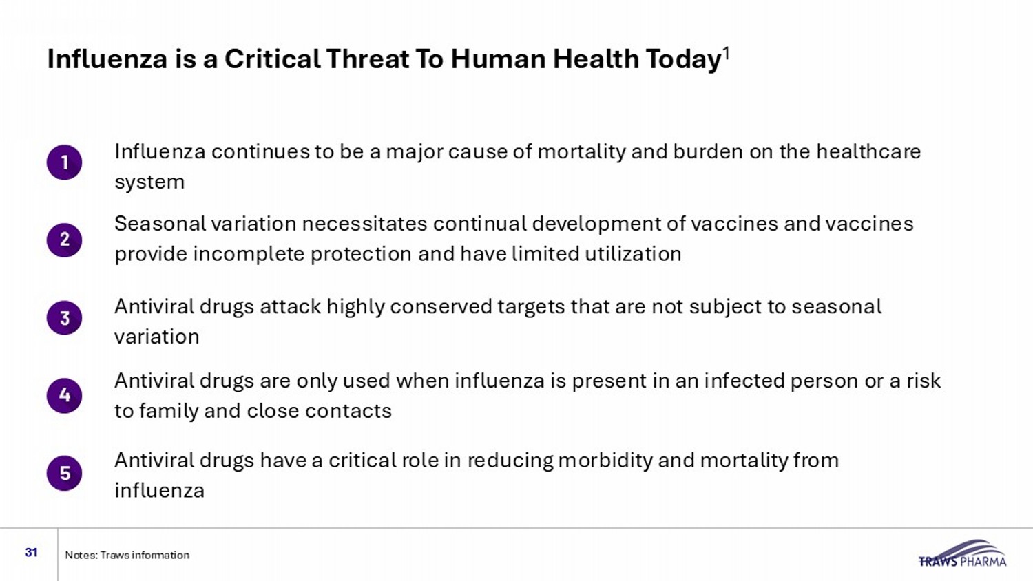 Influenza is a Critical Threat To Human Health Today 1 31 Seasonal variation necessitates continual development of vaccines and vaccines provide incomplete protection and have limited utilization Antiviral drugs attack highly conserved targets that are not subject to seasonal variation 5 Influenz a continues to be a major cause of mortality and burden on the healthcare system Antiviral drugs have a critical role in reducing morbidity and mortality from influenza Antiviral drugs are only used when influenza is present in an infected person or a risk to family and close contacts Notes: Traws information