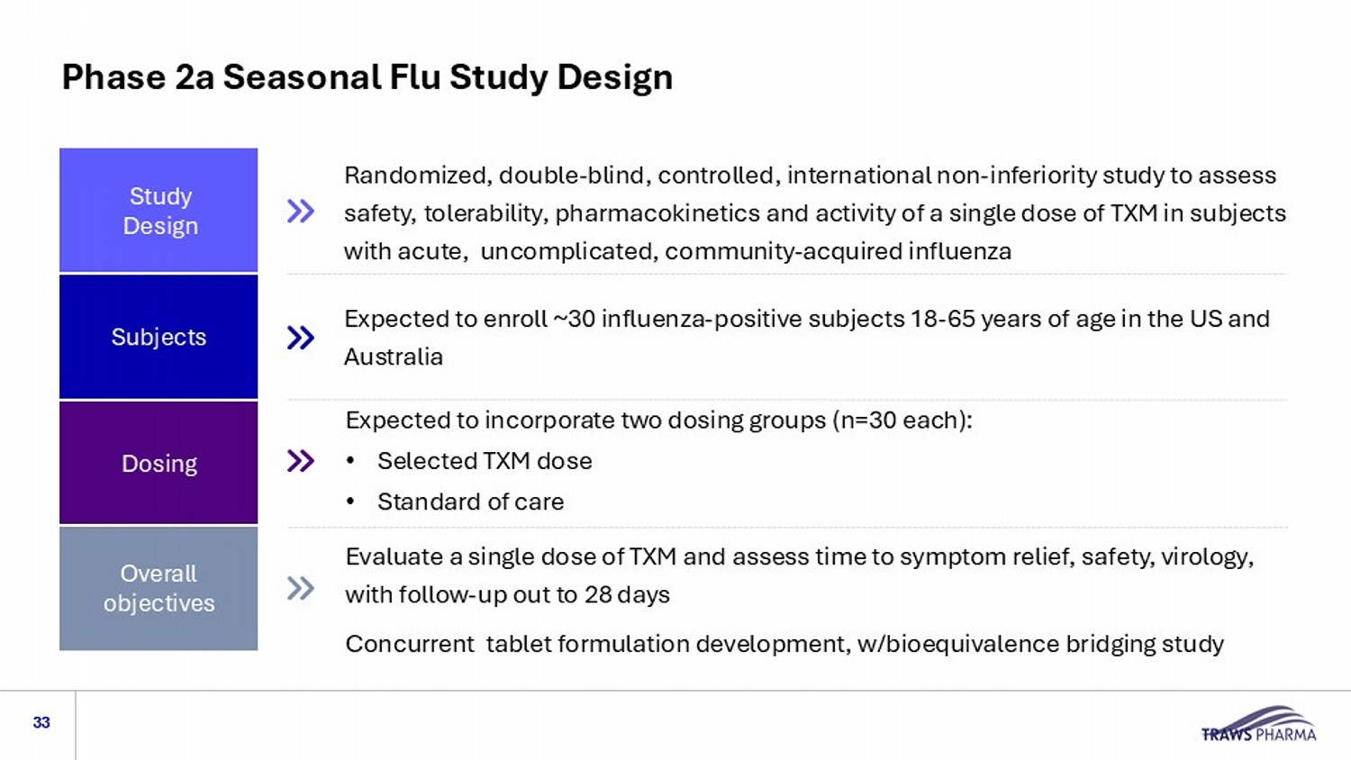 Phase 2a Seasonal Flu Study Design 33 Expected to enroll ~30 influenza - positive subjects 18 - 65 years of age in the US and Australia Expected to incorporate two dosing groups (n=30 each): • Selected TXM dose • Standard of care Evaluate a single dose of TXM and assess time to symptom relief, safety, virology, with follow - up out to 28 days Concurrent tablet formulation development, w/bioequivalence bridging study Randomized, double - blind, controlled, international non - inferiority study to assess safety, tolerability, pharmacokinetics and activity of a single dose of TXM in subjects with acute, uncomplicated, community - acquired influenza Study Design Subjects Overall objectives Dosing