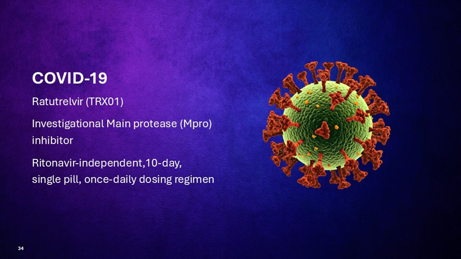 34 COVID - 19 Ratutrelvir (TRX01) Investigational Main protease (Mpro) inhibitor Ritonavir - independent,10 - day, single pill, once - daily dosing regimen