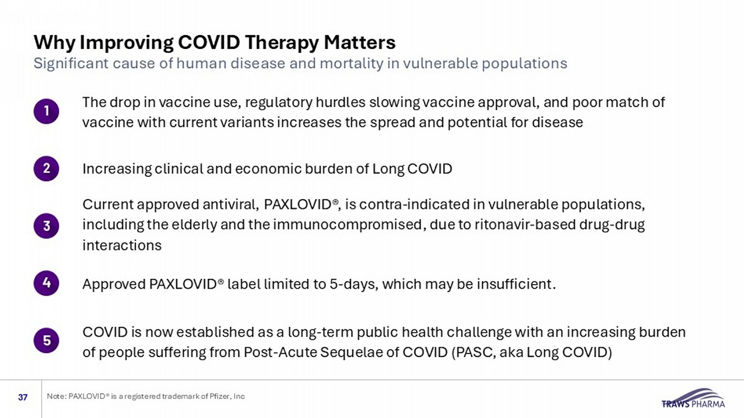 Why Improving COVID Therapy Matters Significant cause of human disease and mortality in vulnerable populations 37 Increasing clinical and economic burden of Long COVID Current approved antiviral, PAXLOVID®, is contra - indicated in vulnerable populations, including the elderly and the immunocompromised, due to ritonavir - based drug - drug interactions The drop in vaccine use, regulatory hurdles slowing vaccine approval, and poor match of vaccine with current variants increases the spread and potential for disease Approved PAXLOVID® label limited to 5 - days, which may be insufficient. Note: PAXLOVID® is a registered trademark of Pfizer, Inc COVID is now established as a long - term public health challenge with an increasing burden of people suffering from Post - Acute Sequelae of COVID (PASC, aka Long COVID)