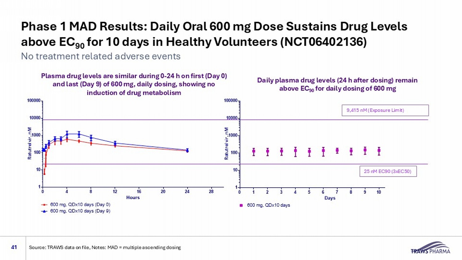 Ratutrelvir is Active Against Viruses with Acquired Resistance to PAXLOVID® or Ensitrelvir 40 PAXLOVID® is a registered trademark of Pfizer, Inc. 1 Tamura, et al. "Emerging SARS - CoV - 2 Resistance After Antiviral Treatment." JAMA Network Open 7(9): e2435431 - e2435431. 2 Uehara, et al., (2025). "Ensitrelvir treatment – emergent amino acid substitutions in SARS - CoV - 2 3CLpro detected in the SCORPIO - S R phase 3 trial." Antiviral Research 236: 106097. 3 In vitro selection for ratutrelvir resistance; Not Detected – mutation not observed after in vitro selection for ratutrelvir res istance; TRAWS internal information Effect of reported mutations on Ratutrelvir Activity 3 Mutations Decreasing Drug Activity by > 2.5 fold Overall Rate of Resistant Variants Clinical Treatment Not Detected G138S 11.4% (in clinical studies) 1 PAXLOVID® <2.5 fold E166V Not Detected H172Y Not Detected Q189K <2.5 fold P252L Not Detected V297A Not Detected M49L 9.3% for 125 mg drug dose 2 Ensitrelvir Not Detected M49I Not Detected S144A Not Detected T25I Not Detected T25A