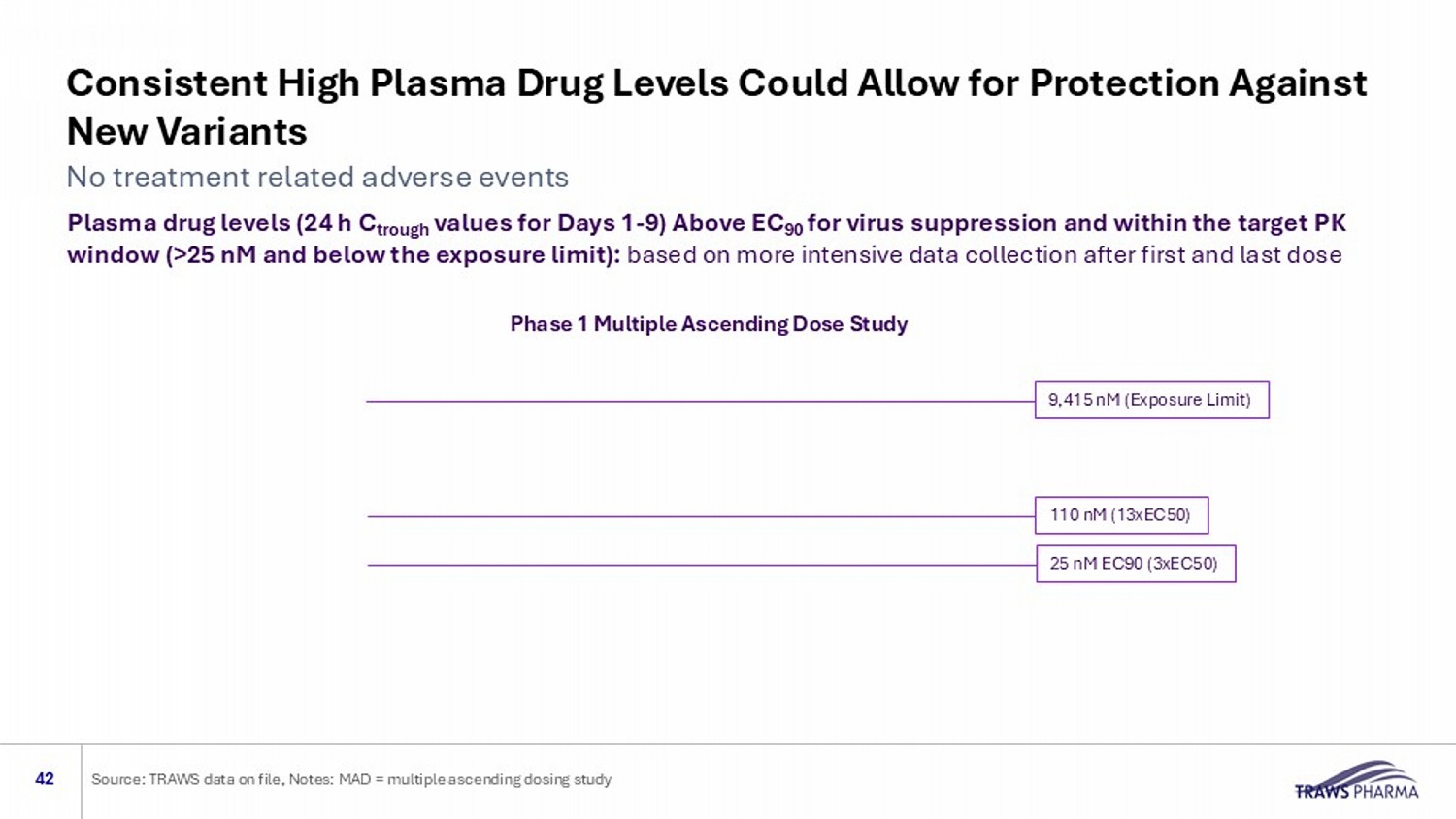 Phase 1 MAD Results: Daily Oral 600 mg Dose Sustains Drug Levels above EC 90 for 10 days in Healthy Volunteers (NCT06402136) 41 No treatment related adverse events Source: TRAWS data on file, Notes: MAD = multiple ascending dosing 9,415 nM (Exposure Limit) 25 nM EC90 (3xEC50) Multiple Ascending Doses in human trough concentrations 0 1 2 3 4 5 6 7 8 9 10 11 12 13 1 10 100 1000 10000 100000 Days R a t u t r e l v i r , n M 48 nM 600 mg, QDx10 days Multiple Ascending Doses in human 0 4 8 12 16 20 24 28 1 10 100 1000 10000 100000 Hours R a t u t r e l v i r , n M 48 nM 600 mg, QDx10 days (Day 0) 600 mg, QDx10 days (Day 9) Plasma drug levels are similar during 0 - 24 h on first (Day 0) and last (Day 9) of 600 mg, daily dosing, showing no induction of drug metabolism Daily plasma drug levels (24 h after dosing) remain above EC 90 for daily dosing of 600 mg
