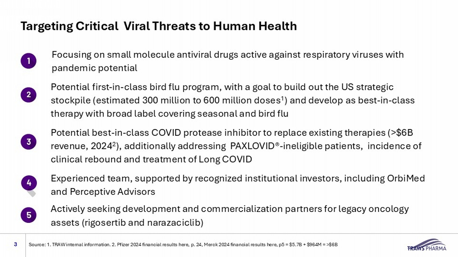 Forward - looking statements 2  This presentation contains, and certain oral statements made by management from time to time may contain, “forward - looking state ments” within the meaning of the “safe harbor” provisions of the Private Securities Litigation Reform Act of 1995, Section 27A of the Securities Act of 1933, as amended (the “Securiti es Act”), and Section 21E of the Securities Exchange Act of 1934, as amended. Such statements include actions, events, results, strategies and expectations and are often identifiable by use of t he words “believes”, “expects”, “intends”, “anticipates”, “plans”, “seeks”, “estimates”, “projects”, “may”, “will”, “could”, “might”, or “continues” or similar expressions. Forward - looking statem ents within this presentation include, but are not limited to, express or implied statements regarding the nature, strategy, opportunities and focus of Traws Pharma, Inc. (“Traws”); the de vel opment, commercial potential and potential benefits of any product candidates; anticipated clinical drug development activities, related timelines and expected milestones; anticipated int eractions with regulatory authorities, including the FDA, HREC, and other international regulatory agencies; and other statements that are not historical fact. All statements other than sta tem ents of historical fact contained in this communication are forward - looking statements. These forward - looking statements are made as of the date they were first issued, and were based on t he then - current expectations, estimates, forecasts, and projections, as well as the beliefs and assumptions of management. There can be no assurance that future developments affecti ng the company will be those that have been anticipated. Forward - looking statements are subject to a number of risks and uncertainties, many of which involve factors or circumstances th at are beyond Traws’ control. Traws’ actual results could differ materially from those stated or implied in forward - looking statements due to a number of factors, including but not limit ed to (i) the uncertainties associated with Traws’ product candidates, as well as risks associated with the clinical development and regulatory approval of product candidates, includin g p otential delays in the commencement and completion of clinical trials, studies and evaluations; (ii) risks related to the inability of Traws to obtain sufficient additional capita l t o continue to advance its product candidates and operate its business; (iii) uncertainties in obtaining successful clinical results for product candidates and unexpected costs that may result therefrom; (i v) risks related to the failure to realize any value from product candidates currently being developed and anticipated to be developed in light of inherent risks and difficulties involved in suc cessfully bringing product candidates to market; (v) uncertainties in retaining key personnel, including the executive team and directors; (vi) risks that may stem from changes in the regulato ry, economic and/or political landscape, (vii) disruption and volatility in the global currency, capital, and credit markets; and (viii) risks associated with the possible failure to realize certain an ticipated benefits of Traws’ 2024 merger with Trawsfynydd Therapeutics, Inc., including with respect to future financial and operating results and the other risks and uncertainties in clu ded in Traws’ Annual Report on Form 10 - K for the year ended December 31, 2024 and Traws’ subsequent filings with the U.S. Securities and Exchange Commission (the “SEC”). Actual results and the timing of events could differ materially from those anticipated in such forward - looking statements as a result of these risks and uncertainties. You should not place undue reliance on these forward - looking statements, which are made only as of the date hereof or as of the dates indicated in the forward - looking statements. Traws expressly disclaims any obligation or u ndertaking, unless required by applicable law, to release publicly any updates or revisions to any forward - looking statements contained herein to reflect any change in its expectations with regar d thereto or any change in events, conditions or circumstances on which any such statements are based. This communication does not purport to summarize all of the conditions, risks and oth er attributes of an investment in Traws. This presentation is for informational purposes only and shall not constitute an offer to sell or a solicitation of an offer to buy the securities of the Traws, nor shall there be any sale of any such securities in any state or jurisdiction in which such offer, solicitation, or sale would be unlawful prior to registration or qualification under the se cur ities laws of such state or jurisdiction. No offer of securities shall be made, except by means of a prospectus meeting the requirements of Section 10 of the Securities Act or an exemption therefrom.