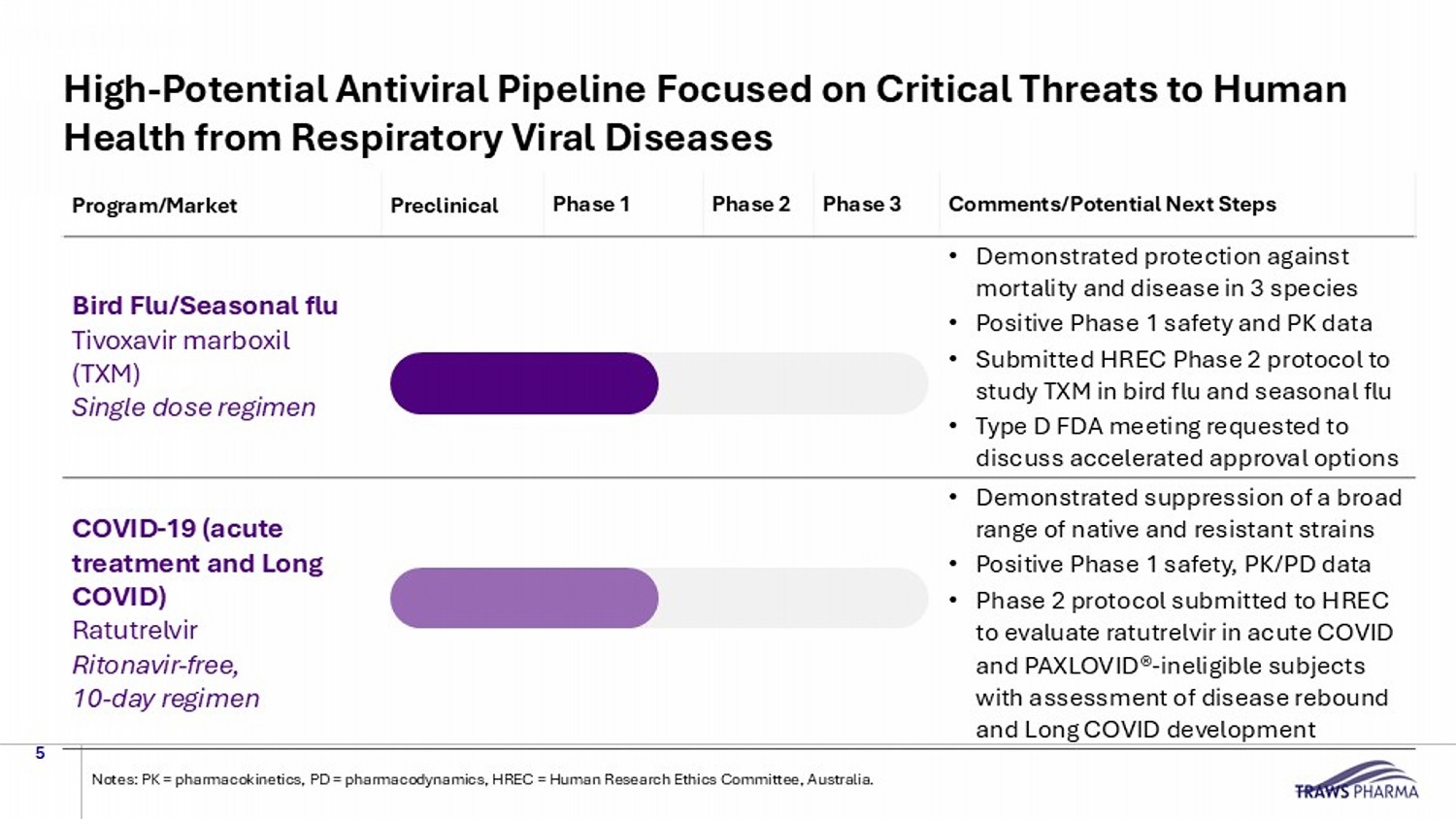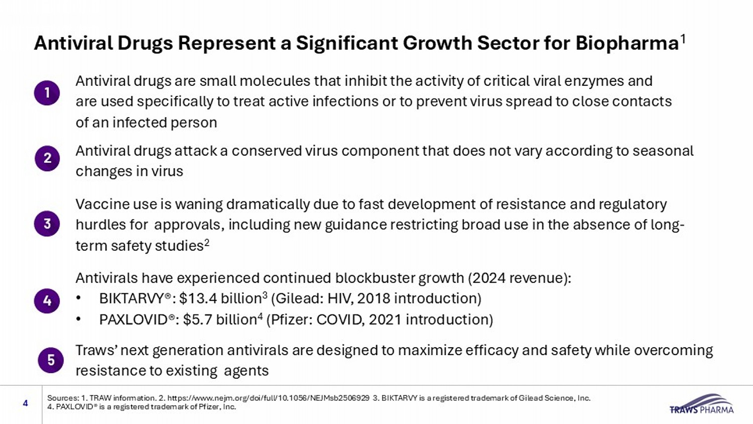 Targeting Critical Viral Threats to Human Health 3 Potential first - in - class bird flu program , with a goal to build out the US strategic stockpile (estimated 300 million to 600 million doses 1 ) and develop as best - in - class therapy with broad label covering seasonal and bird flu Potential best - in - class COVID protease inhibitor to replace existing therapies (>$6B revenue, 2024 2 ), additionally addressing PAXLOVID® - ineligible patients, incidence of clinical rebound and treatment of Long COVID 4 5 F ocusing on small molecule antiviral drugs active against respiratory viruses with pandemic potential Experienced team, supported by recognized institutional investors, including OrbiMed and Perceptive Advisors Actively seeking development and commercialization partners for legacy oncology assets (rigosertib and narazaciclib) Source: 1. TRAW internal information. 2. Pfizer 2024 financial results here, p. 24, Merck 2024 financial results here, p5 = $ 5.7 B + $964M = >$6B