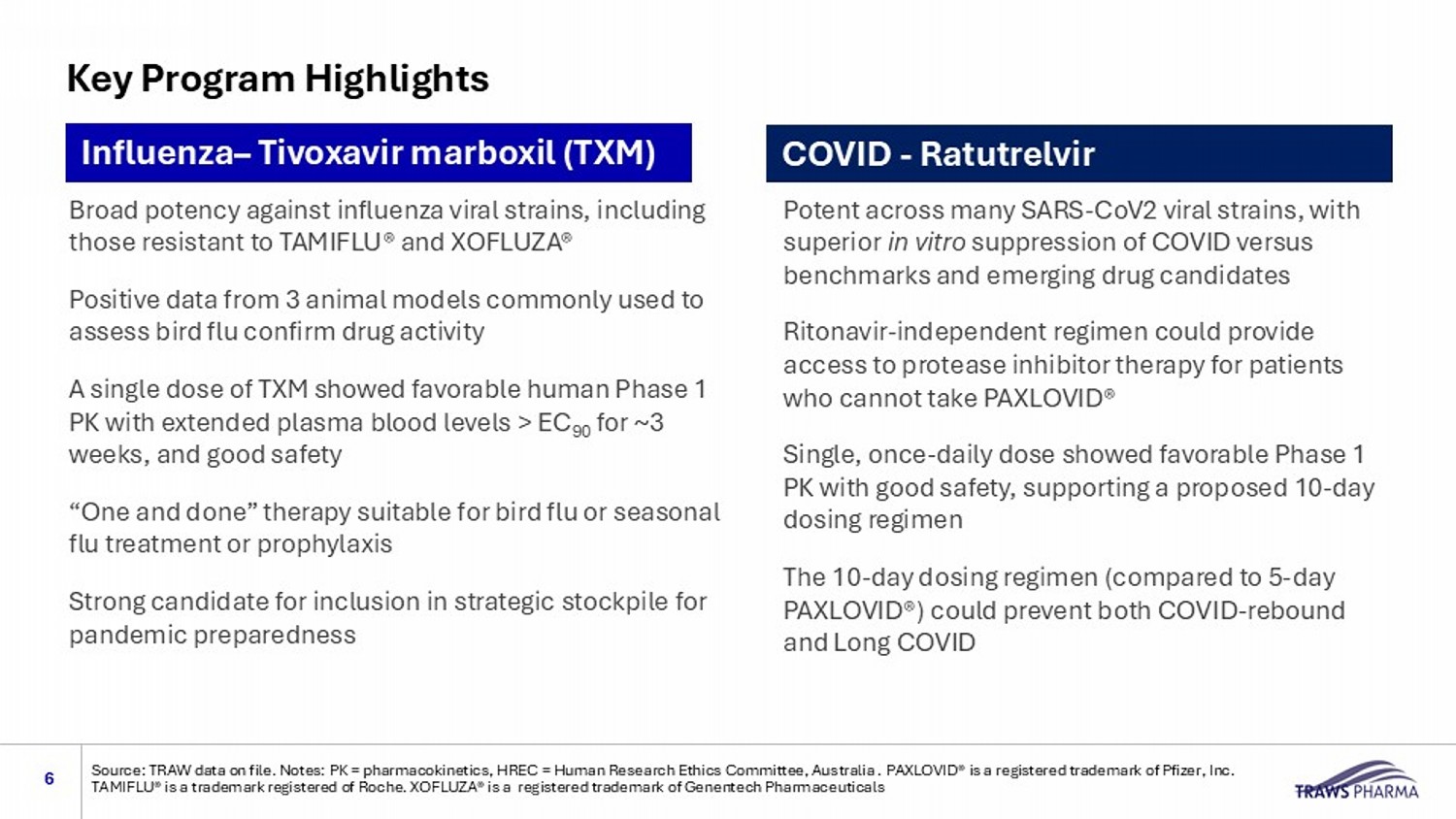 4 Antiviral drugs attack a conserved virus component that does not vary according to seasonal changes in virus Antiviral drugs are small molecules that inhibit the activity of critical viral enzymes and are used specifically to treat active infections or to prevent virus spread to close contacts of an infected person Sources: 1. TRAW information. 2. https://www.nejm.org/doi/full/10.1056/NEJMsb2506929 3. BIKTARVY is a registered trademark o f G ilead Science, Inc. 4. PAXLOVID® is a registered trademark of Pfizer, Inc. 5 Antiviral Drugs Represent a Significant Growth Sector for Biopharma 1 V accine use is waning dramatically due to fast development of resistance and regulatory hurdles for approvals, including new guidance restricting broad use in the absence of long - term safety studies 2 Antivirals have experienced continued blockbuster growth (2024 revenue): • BIKTARVY®: $13.4 billion 3 (Gilead: HIV, 2018 introduction) • PAXLOVID®: $5.7 billion 4 (Pfizer: COVID, 2021 introduction) Traws’ next generation antivirals are designed to maximize efficacy and safety while overcoming resistance to existing agents