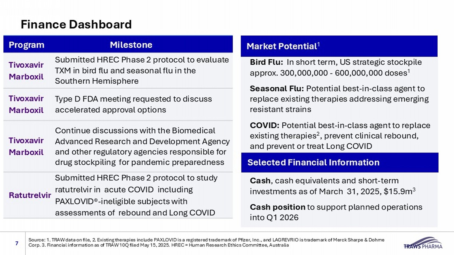 Key Program Highlights 6 Source: TRAW data on file. Notes: PK = pharmacokinetics, HREC = Human Research Ethics Committee, Australia . PAXLOVID® is a r egi stered trademark of Pfizer, Inc. TAMIFLU® is a trademark registered of Roche. XOFLUZA® is a registered trademark of Genentech Pharmaceuticals Influenza – Tivoxavir marboxil (TXM) COVID - Ratutrelvir Broad potency against influenza viral strains, including those resistant to TAMIFLU® and XOFLUZA® Positive data from 3 animal models commonly used to assess bird flu confirm drug activity A single dose of TXM showed favorable human Phase 1 PK with extended plasma blood levels > EC 90 for ~3 weeks, and good safety “One and done” therapy suitable for bird flu or seasonal flu treatment or prophylaxis Strong candidate for inclusion in strategic stockpile for pandemic preparedness Potent across many SARS - CoV2 viral strains, with superior in vitro suppression of COVID versus benchmarks and emerging drug candidates Ritonavir - independent regimen could provide access to protease inhibitor therapy for patients who cannot take PAXLOVID® Single, once - daily dose showed favorable Phase 1 PK with good safety, supporting a proposed 10 - day dosing regimen The 10 - day dosing regimen (compared to 5 - day PAXLOVID® ) could prevent both COVID - rebound and Long COVID