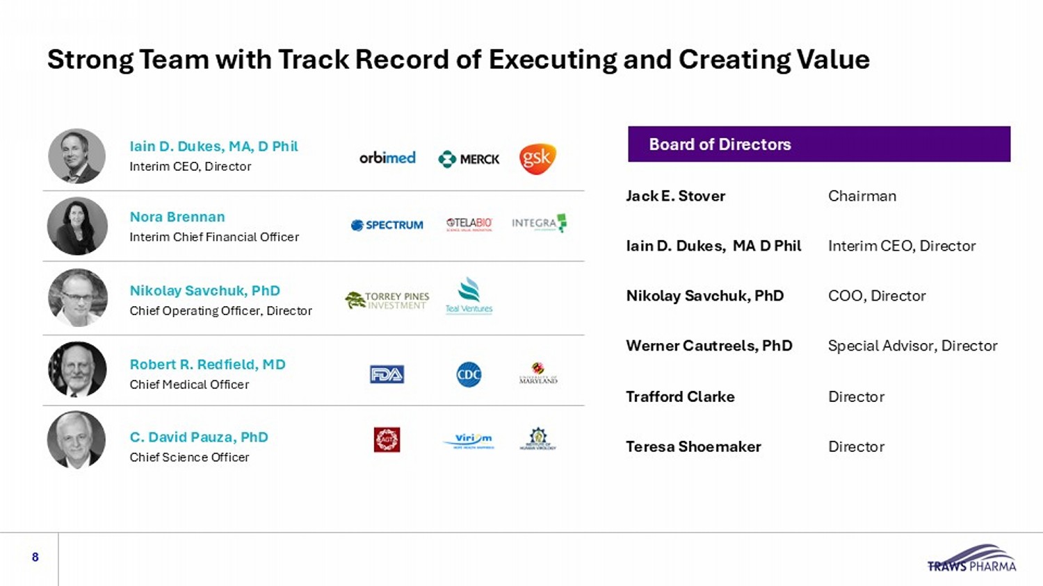 Bird Flu: In short term, US strategic stockpile approx. 300,000,000 - 600,000,000 doses 1 Seasonal Flu: Potential best - in - class agent to replace existing therapies addressing emerging resistant strains COVID: Potential b est - in - class agent to replace existing therapies 2 , prevent clinical rebound, and prevent or treat Long COVID Cash , cash equivalents and short - term investments as of March 31, 2025, $15.9m 3 Cash position to support planned operations into Q1 2026 Selected Financial Information Milestone Program Submitted HREC Phase 2 protocol to evaluate TXM in bird flu and seasonal flu in the Southern Hemisphere Tivoxavir Marboxil Type D FDA meeting requested to discuss accelerated approval options Tivoxavir Marboxil Continue discussions with the Biomedical Advanced Research and Development Agency and other regulatory agencies responsible for drug stockpiling for pandemic preparedness Tivoxavir Marboxil Submitted HREC Phase 2 protocol to study ratutrelvir in acute COVID including PAXLOVID® - ineligible subjects with assessments of rebound and Long COVID Ratutrelvir Finance Dashboard Source: 1. TRAW data on file, 2. Existing therapies include PAXLOVID is a registered trademark of Pfizer, Inc., and LAGREVRIO is trademark of Merck Sharpe & Dohme Corp. 3. Financial information as of TRAW 10Q filed May 15, 2025. HREC = Human Research Ethics Committee, Australia Market Potential 1 7