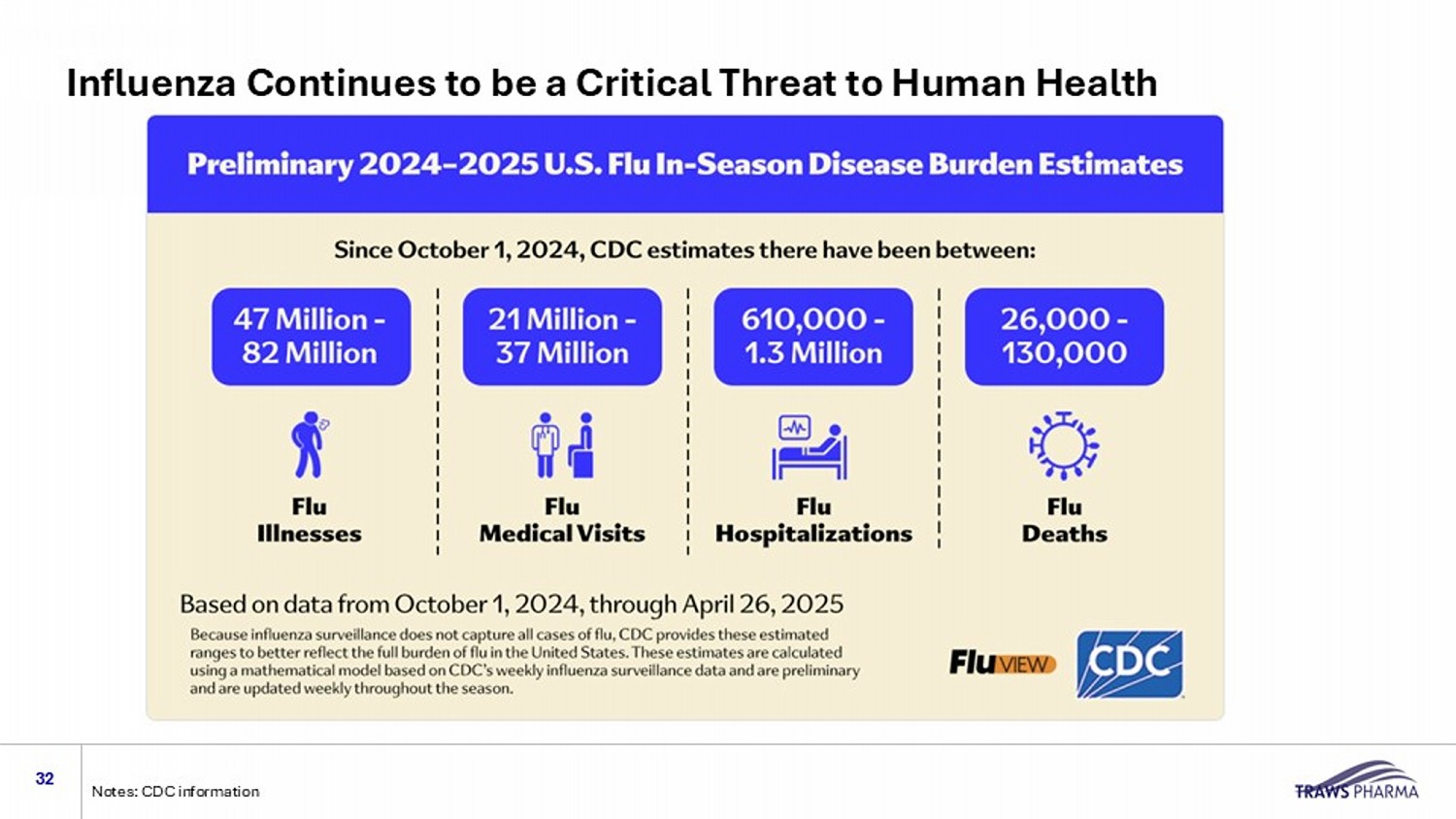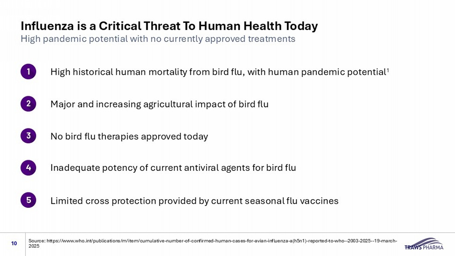 Influenza is a Critical Threat To Human Health Today High pandemic potential with no currently approved treatments 10 Major and increasing agricultural impact of bird flu No bird flu therapies approved today 4 5 High historical human mortality from bird flu, with human pandemic potential 1 L imited cross protection provided by current seasonal flu vaccines Inadequate potency of current antiviral agents for bird flu Source: https://www.who.int/publications/m/item/cumulative - number - of - confirmed - human - cases - for - avian - influenza - a(h5n1) - reported - to - who -- 2003 - 2025 -- 19 - march - 2025