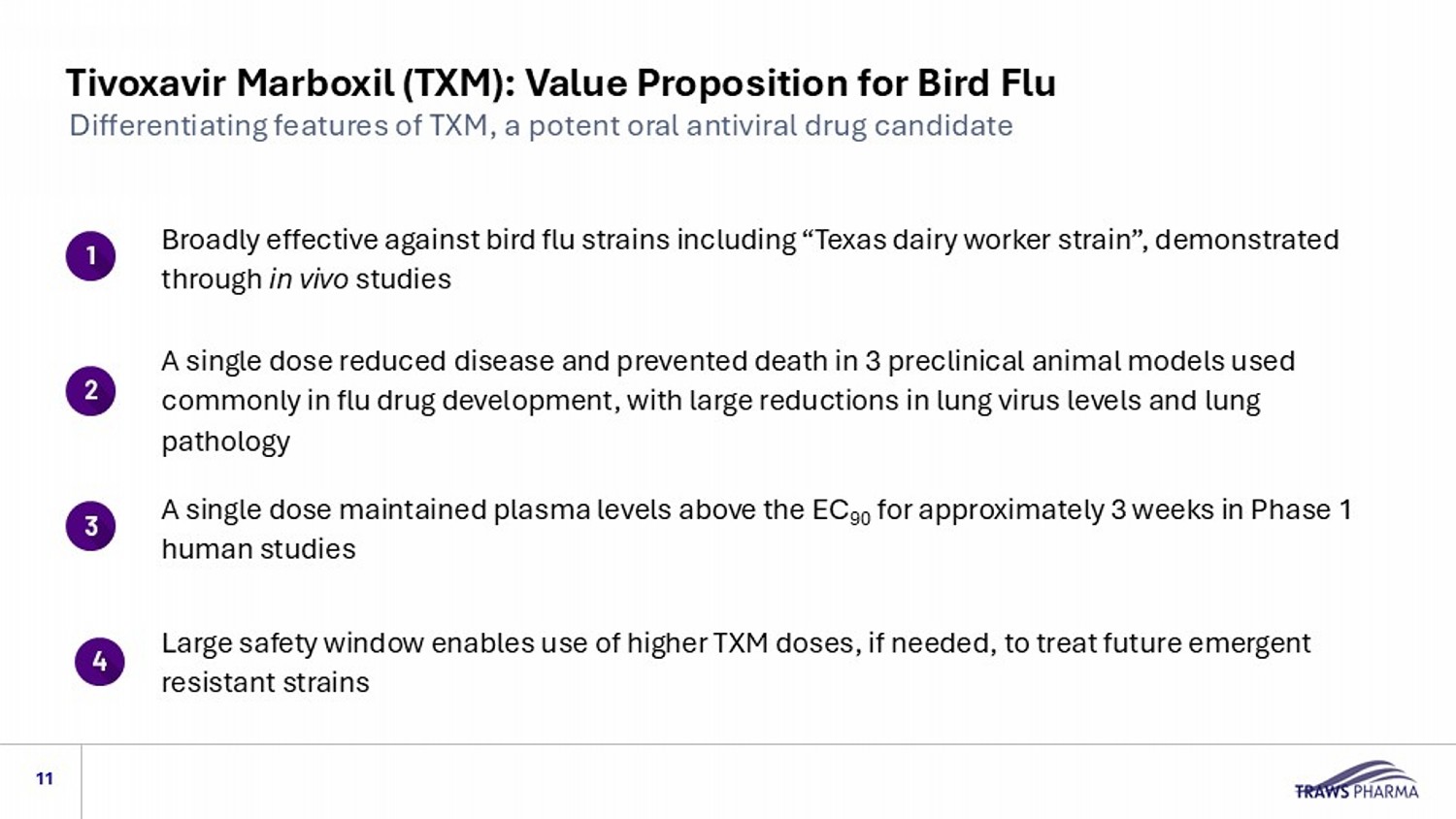 Tivoxavir Marboxil (TXM): Value Proposition for Bird Flu 11 Differentiating features of TXM, a potent oral antiviral drug candidate A single dose reduced disease and prevented death in 3 preclinical animal models used commonly in flu drug development, with large reductions in lun g virus levels and lung pathology A singl e dose maintained plasma levels above the EC 90 for approximately 3 weeks in Phase 1 human studies 4 5 Broadly effective against bird flu strains including “Texas dairy worker strain”, demonstrated through in vivo studies Large safety window enables use of higher TXM doses, if needed, to treat future emergent resistant strains