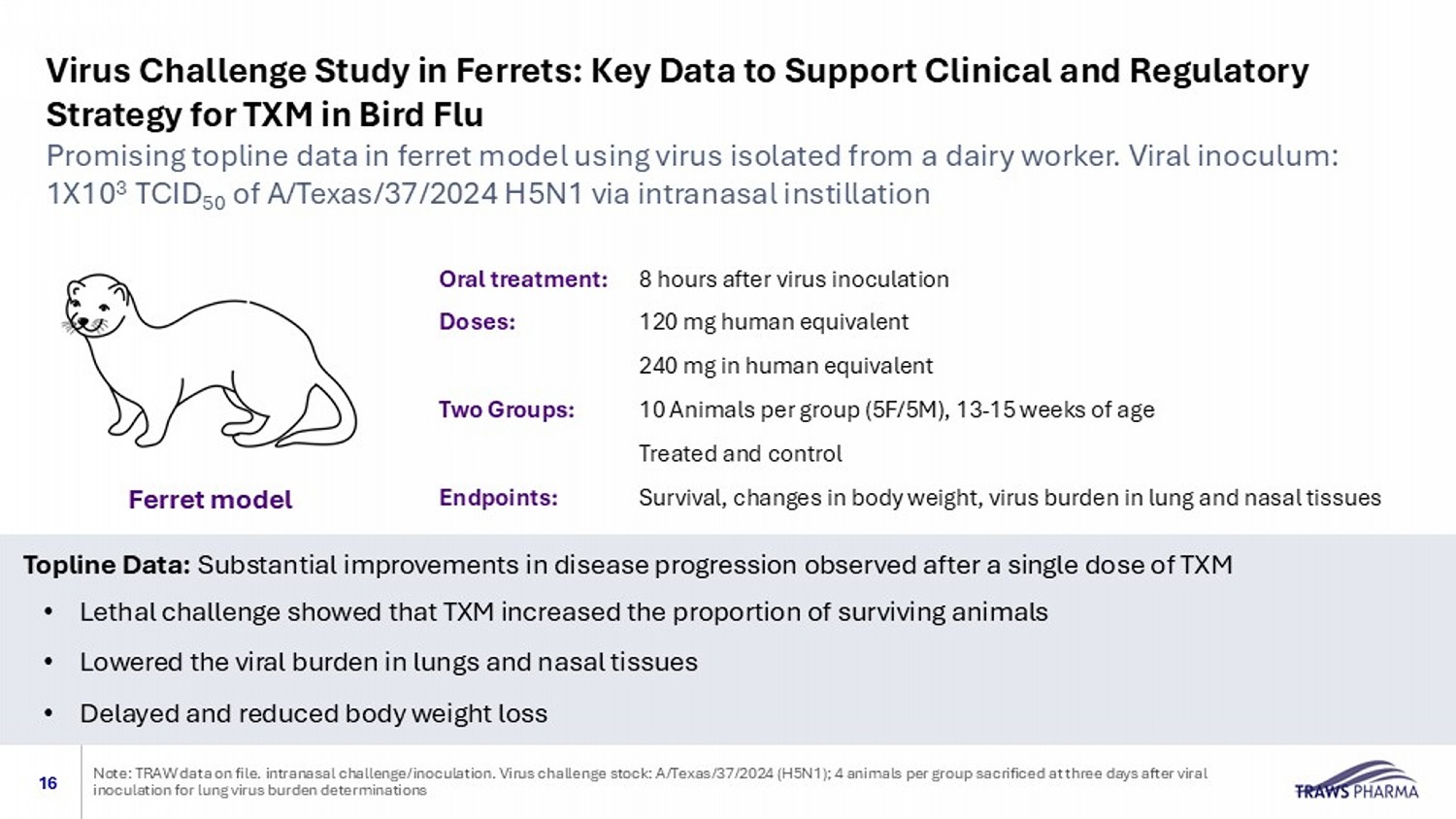 15 1. Virus challenge protocol per slide 14. TCID = tissue culture infectious dose Virus Titer Group Animal 7x10 8 Vehicle 31 1.3x10 7 32 1.3x10 8 33 8.2x10 8 34 1.2x10 7 35 Virus Titer Group Animal BLLQ TXM Day 1 dose of 50 mg/kg 46 BLLQ 47 BLLQ 48 BLLQ 49 BLLQ 50 Virus titer – TCID 50 /gram of tissue; BLLQ – below lower limit of quantitation (2.2x10 3 TCID 50 /gram) Day 3 Lung Virus Titers (TCID 50 ) TXM Achieved Complete Viral Clearance in the Lung Based on murine viral challenge studies 1