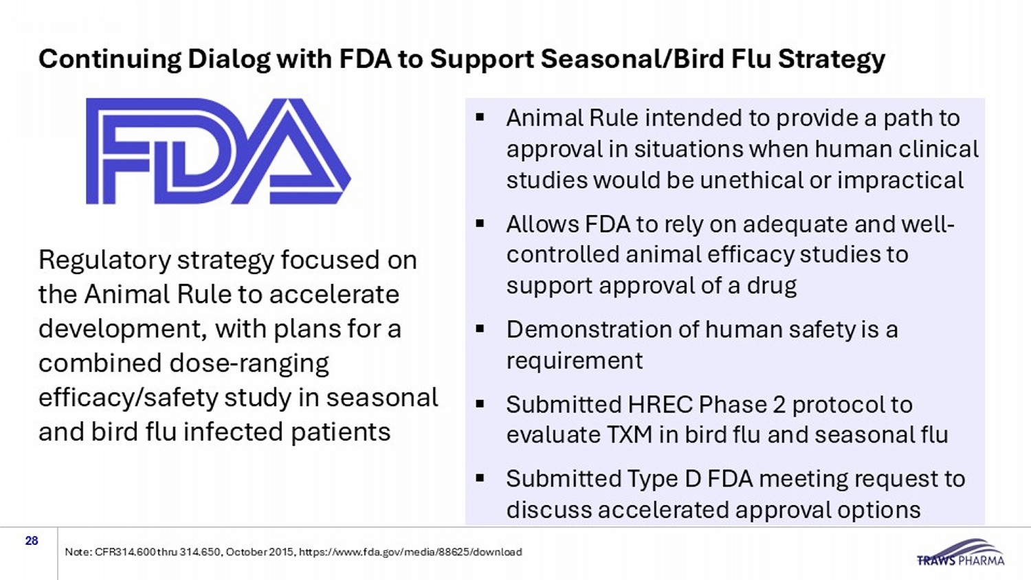 Sources: 1. CFR314.600 thru 314.650, October 2015, https://www.fda.gov/media/88625/download. 2 . Traws information 3. b ird flu case fatality rate: WHO information : https://cdn.who.int/media/docs/default - source/wpro --- documents/emergency/surveillance/avian - influenza/ai_20250131.pdf. TXM Could Be a Fit for the “Animal Rule” 1,2 Human challenge studies of bird flu are not possible • Virus evolved to a more virulent strain (dairy worker, mild symptoms) • History of A/H5N1 virus strains with up to 50% case fatality rate 3 • Virus can be 100% fatal in 3 - 5 days in animals (mice, ferrets, NHP) 2 • Placebo - controlled trials would be unethical and not feasible • Preclinical studies used commonly accepted flu models (mice, ferrets and non - human primates) • Positive Phase 1 safety/dosing escalation data (healthy volunteers) includes dose levels that were protective in animal studies • Maintained plasma levels above the EC 90 for more than 3 weeks, with good overall safety Requires Adequate and Well - Controlled Animal Studies Exceptional Pathogenic Potential Human Safety and Pharmacokinetics are Required 29