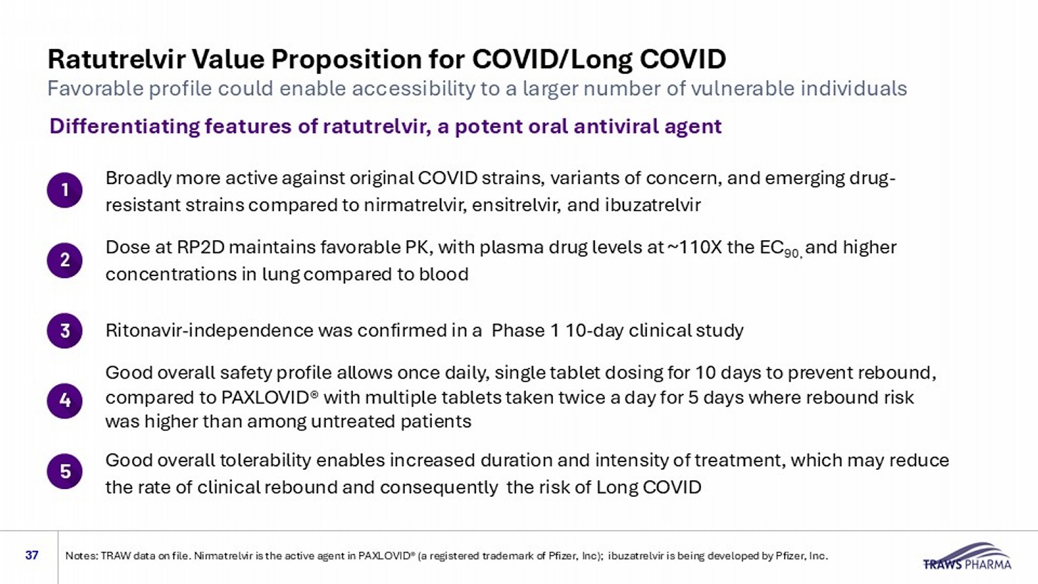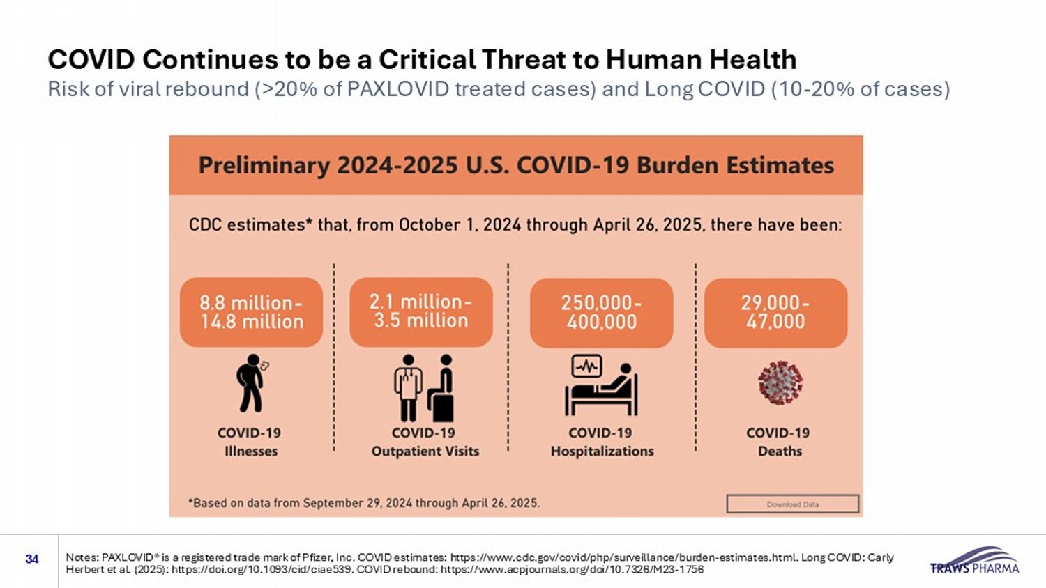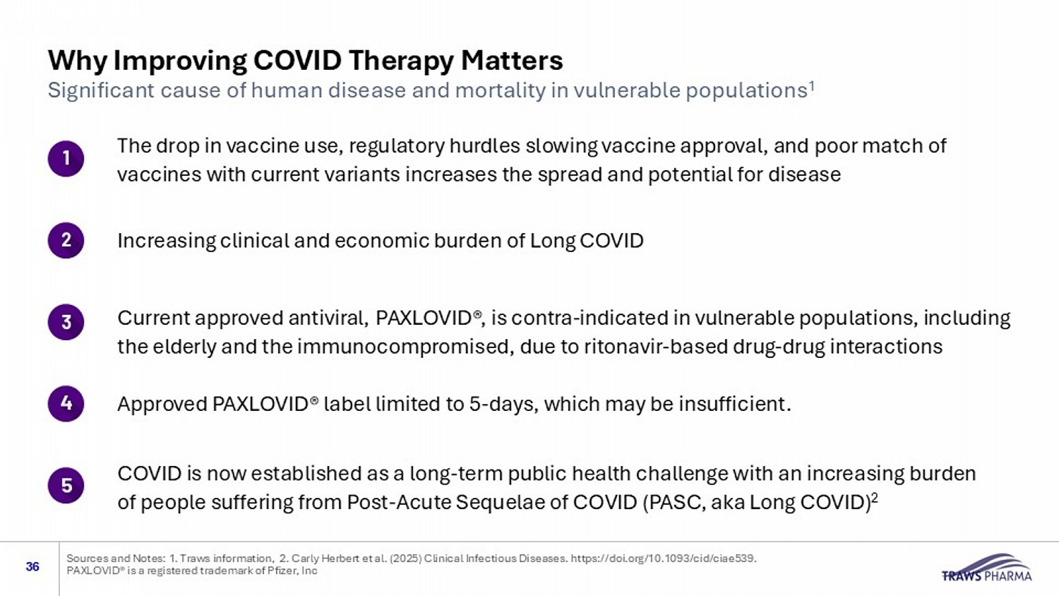 Why Improving COVID Therapy Matters Significant cause of human disease and mortality in vulnerable populations 1 36 Increasing clinical and economic burden of Long COVID Current approved antiviral, PAXLOVID®, is contra - indicated in vulnerable populations, including the elderly and the immunocompromised, due to ritonavir - based drug - drug interactions The drop in vaccine use, regulatory hurdles slowing vaccine approval, and poor match of vaccines with current variants increases the spread and potential for disease Approved PAXLOVID® label limited to 5 - days, which may be insufficient. Sources and Notes: 1. Traws information, 2. Carly Herbert et al. (2025) Clinical Infectious Diseases. https://doi.org/10.109 3/c id/ciae539. PAXLOVID® is a registered trademark of Pfizer, Inc COVID is now established as a long - term public health challenge with an increasing burden of people suffering from Post - Acute Sequelae of COVID (PASC, aka Long COVID) 2