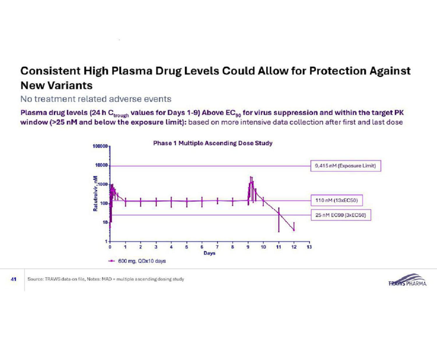 Phase 1 MAD Results: Daily Oral 600 mg Dose Sustains Drug Levels above EC 90 for 10 days in Healthy Volunteers (NCT06402136) 40 No treatment related adverse events Source: TRAWS data on file, Notes: MAD = multiple ascending dosing 9,415 nM (Exposure Limit) 25 nM EC90 (3xEC50) Multiple Ascending Doses in human trough concentrations 0 1 2 3 4 5 6 7 8 9 10 11 12 13 1 10 100 1000 10000 100000 Days R a t u t r e l v i r , n M 48 nM 600 mg, QDx10 days Multiple Ascending Doses in human 0 4 8 12 16 20 24 28 1 10 100 1000 10000 100000 Hours R a t u t r e l v i r , n M 48 nM 600 mg, QDx10 days (Day 0) 600 mg, QDx10 days (Day 9) Plasma drug levels are similar during 0 - 24 h on first (Day 0) and last (Day 9) of 600 mg, daily dosing, showing no induction of drug metabolism Daily plasma drug levels (24 h after dosing) remain above EC 90 for daily dosing of 600 mg