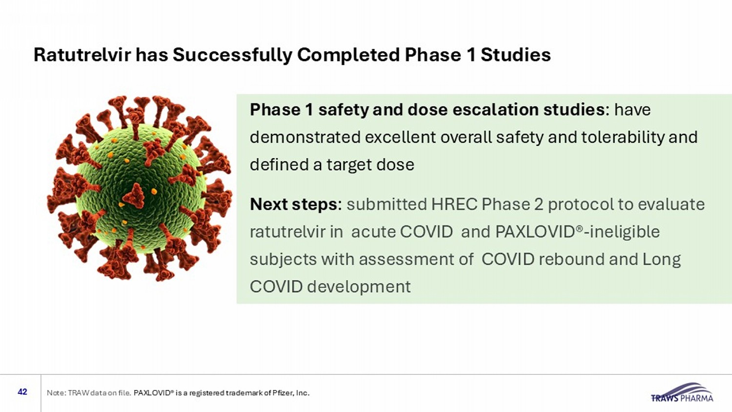 Ratutrelvir is Active Against Viruses with Acquired Resistance to PAXLOVID® or Ensitrelvir 39 Notes/Sources: PAXLOVID® is a registered trademark of Pfizer, Inc. 1 Tamura, et al. "Emerging SARS - CoV - 2 Resistance After Antiviral Treatment." JAMA Network Open 7(9): e2435431 - e2435431. 2 Uehara, et al., (2025). "Ensitrelvir treatment – emergent amino acid substitutions in SARS - CoV - 2 3CLpro detected in the SCORPIO - S R phase 3 trial." Antiviral Research 236: 106097. 3 In vitro selection for ratutrelvir resistance; Not Detected – mutation not observed after in vitro selection for ratutrelvir res istance; TRAWS internal information Effect of Reported Mutations on Ratutrelvir Activity 3 Mutations Decreasing Drug Activity by > 2.5 fold Overall Rate of Resistant Variants Clinical Treatment Not Detected G138S 11.4% (in clinical studies) 1 PAXLOVID® <2.5 fold E166V Not Detected H172Y Not Detected Q189K <2.5 fold P252L Not Detected V297A Not Detected M49L 9.3% for 125 mg drug dose 2 Ensitrelvir Not Detected M49I Not Detected S144A Not Detected T25I Not Detected T25A