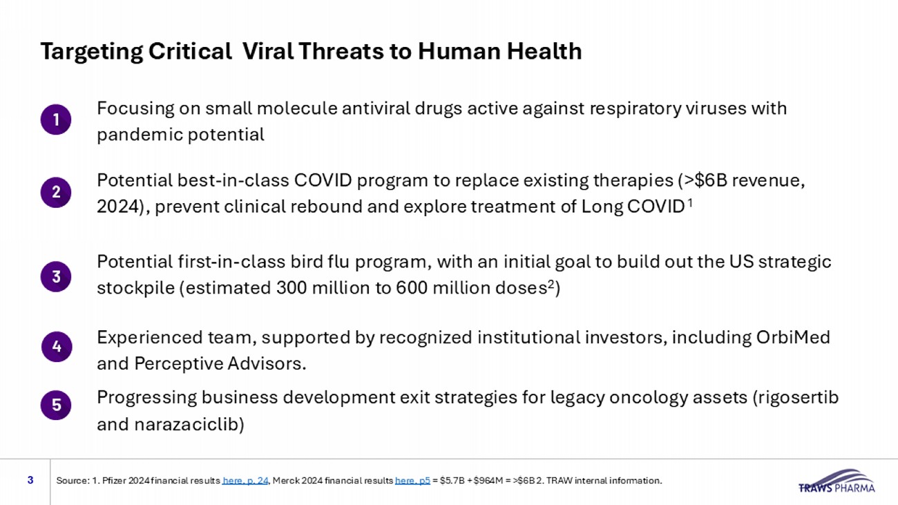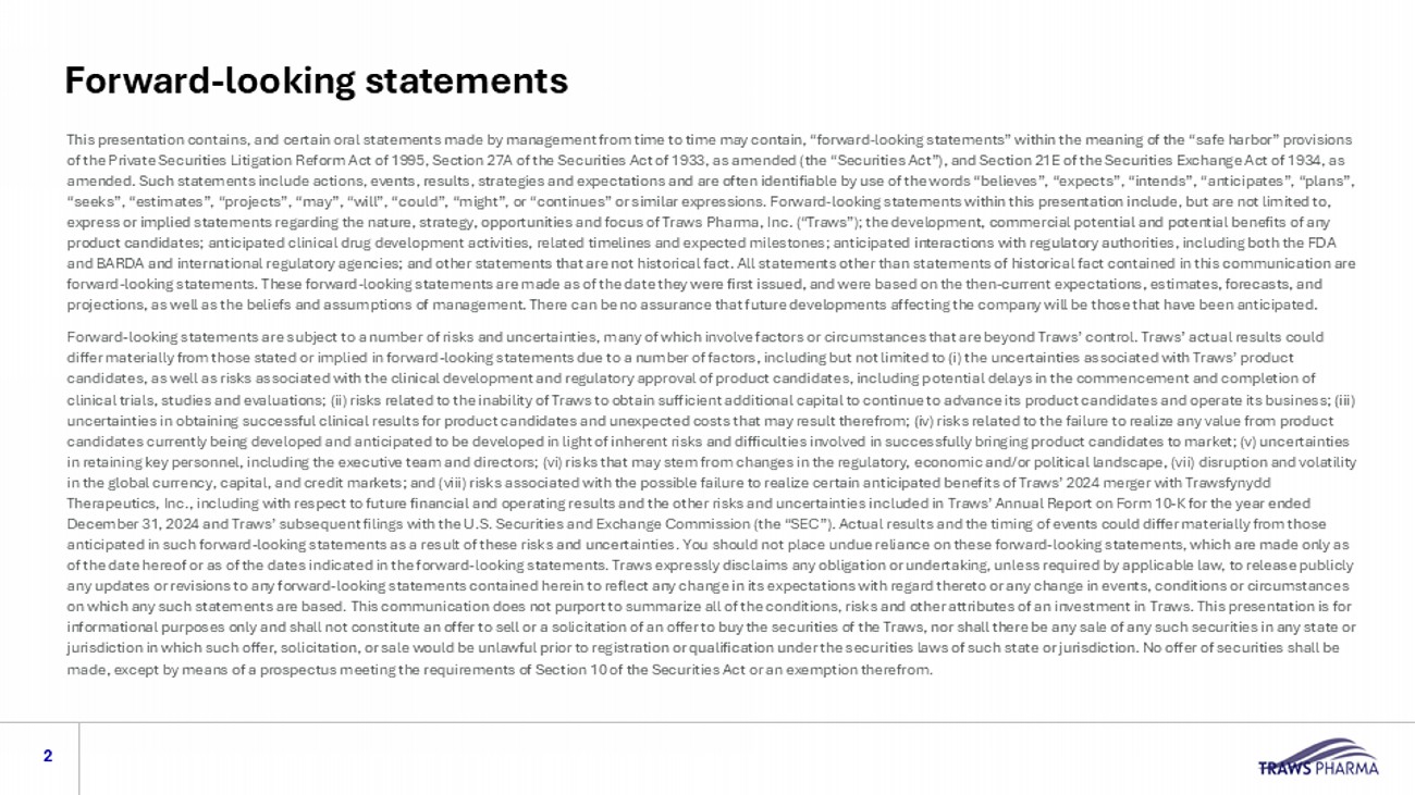 Forward - looking statements 2  This presentation contains, and certain oral statements made by management from time to time may contain, “forward - looking state ments” within the meaning of the “safe harbor” provisions of the Private Securities Litigation Reform Act of 1995, Section 27A of the Securities Act of 1933, as amended (the “Securiti es Act”), and Section 21E of the Securities Exchange Act of 1934, as amended. Such statements include actions, events, results, strategies and expectations and are often identifiable by use of t he words “believes”, “expects”, “intends”, “anticipates”, “plans”, “seeks”, “estimates”, “projects”, “may”, “will”, “could”, “might”, or “continues” or similar expressions. Forward - looking statem ents within this presentation include, but are not limited to, express or implied statements regarding the nature, strategy, opportunities and focus of Traws Pharma, Inc. (“ Traws ”); the development, commercial potential and potential benefits of any product candidates; anticipated clinical drug development activities, related timelines and expected milestones; anticipated int eractions with regulatory authorities, including both the FDA and BARDA and international regulatory agencies; and other statements that are not historical fact. All statements other than st atements of historical fact contained in this communication are forward - looking statements. These forward - looking statements are made as of the date they were first issued, and were based on t he then - current expectations, estimates, forecasts, and projections, as well as the beliefs and assumptions of management. There can be no assurance that future developments affecti ng the company will be those that have been anticipated. Forward - looking statements are subject to a number of risks and uncertainties, many of which involve factors or circumstances th at are beyond Traws ’ control. Traws ’ actual results could differ materially from those stated or implied in forward - looking statements due to a number of factors, including but not limit ed to ( i ) the uncertainties associated with Traws ’ product candidates, as well as risks associated with the clinical development and regulatory approval of product candidates, includin g p otential delays in the commencement and completion of clinical trials, studies and evaluations; (ii) risks related to the inability of Traws to obtain sufficient additional capital to continue to advance its product candidates and operate its business; (iii) uncertainties in obtaining successful clinical results for product candidates and unexpected costs that may result therefrom; (i v) risks related to the failure to realize any value from product candidates currently being developed and anticipated to be developed in light of inherent risks and difficulties involved in suc cessfully bringing product candidates to market; (v) uncertainties in retaining key personnel, including the executive team and directors; (vi) risks that may stem from changes in the regulato ry, economic and/or political landscape, (vii) disruption and volatility in the global currency, capital, and credit markets; and (viii) risks associated with the possible failure to realize certain an ticipated benefits of Traws ’ 2024 merger with Trawsfynydd Therapeutics, Inc., including with respect to future financial and operating results and the other risks and uncertainties in clu ded in Traws ’ Annual Report on Form 10 - K for the year ended December 31, 2024 and Traws ’ subsequent filings with the U.S. Securities and Exchange Commission (the “SEC”). Actual results and the timing of events co uld differ materially from those anticipated in such forward - looking statements as a result of these risks and uncertainties. You should not place undue reliance on these forward - looking statements, which are made only as of the date hereof or as of the dates indicated in the forward - looking statements. Traws expressly disclaims any obligation or undertaking, unless required by applicable law, to release publicly any updates or revisions to any forward - looking statements contained herein to reflect any change in its expectations with regar d thereto or any change in events, conditions or circumstances on which any such statements are based. This communication does not purport to summarize all of the conditions, risks and oth er attributes of an investment in Traws . This presentation is for informational purposes only and shall not constitute an offer to sell or a solicitation of an offer to buy the securities of the Traws , nor shall there be any sale of any such securities in any state or jurisdiction in which such offer, solicitation, or sale would be unlawful prior to registration or qualification under the se cur ities laws of such state or jurisdiction. No offer of securities shall be made, except by means of a prospectus meeting the requirements of Section 10 of the Securities Act or an exemption therefrom.