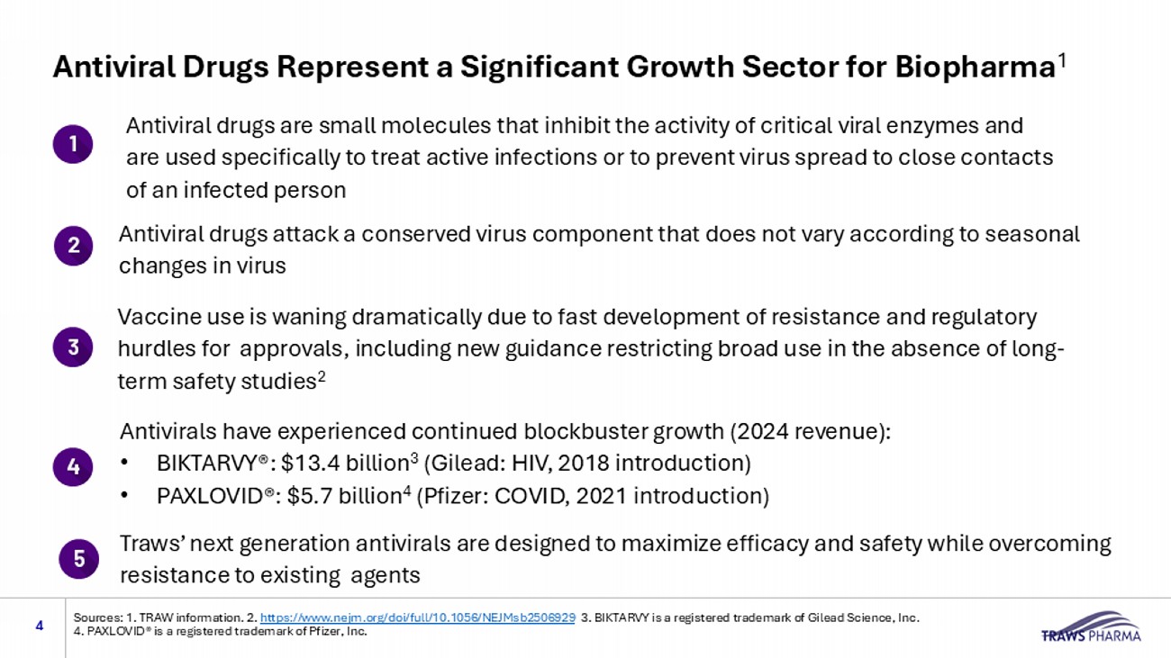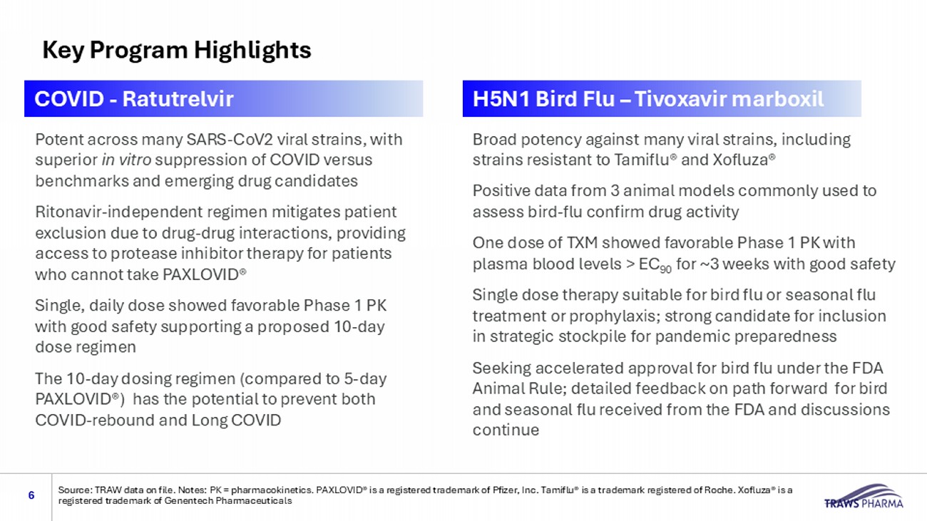 4 Antiviral drugs attack a conserved virus component that does not vary according to seasonal changes in virus Antiviral drugs are small molecules that inhibit the activity of critical viral enzymes and are used specifically to treat active infections or to prevent virus spread to close contacts of an infected person Sources: 1. TRAW information. 2. https://www.nejm.org/doi/full/10.1056/NEJMsb2506929 3. BIKTARVY is a registered trademark of Gilead Science, Inc. 4. PAXLOVID® is a registered trademark of Pfizer, Inc. 5 Antiviral Drugs Represent a Significant Growth Sector for Biopharma 1 V accine use is waning dramatically due to fast development of resistance and regulatory hurdles for approvals, including new guidance restricting broad use in the absence of long - term safety studies 2 Antivirals have experienced continued blockbuster growth (2024 revenue): • BIKTARVY®: $13.4 billion 3 (Gilead: HIV, 2018 introduction) • PAXLOVID®: $5.7 billion 4 (Pfizer: COVID, 2021 introduction) Traws ’ next generation antivirals are designed to maximize efficacy and safety while overcoming resistance to existing agents