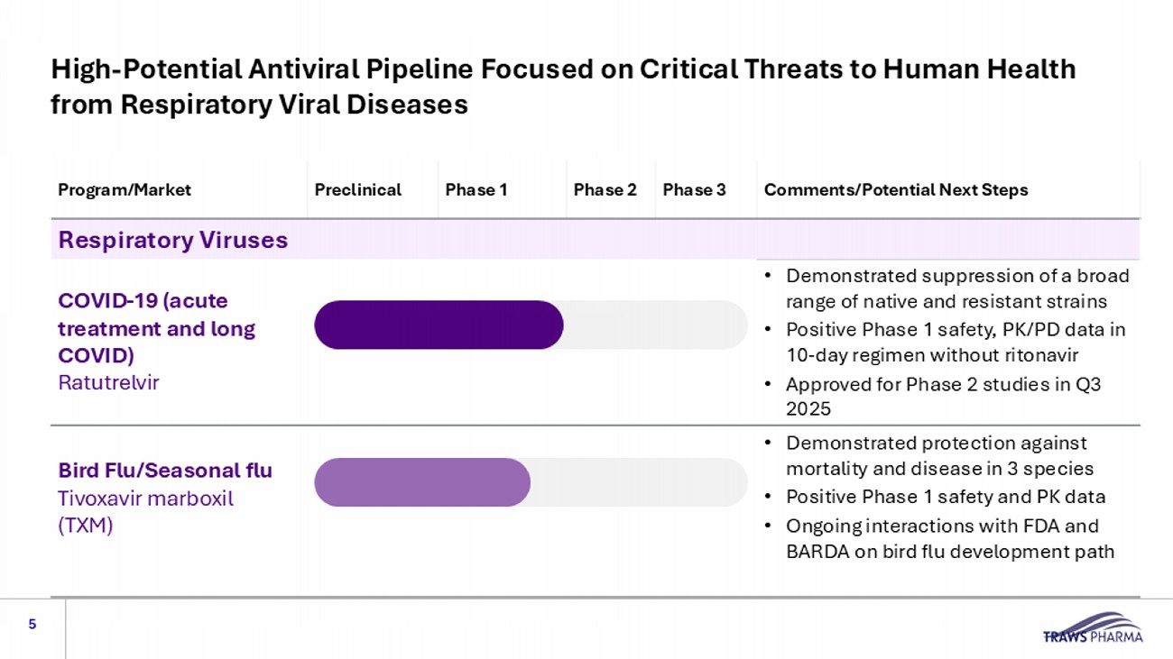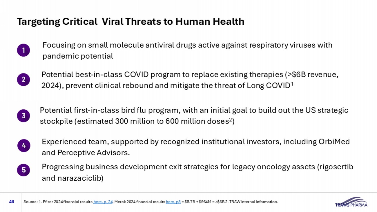Targeting Critical Viral Threats to Human Health 3 Potential first - in - class bird flu program , with an initial goal to build out the US strategic stockpile (estimated 300 million to 600 million doses 2 ) Potential best - in - class COVID program to replace existing therapies (>$6B revenue, 2024), prevent clinical rebound and explore treatment of Long COVID 1 4 5 F ocusing on small molecule antiviral drugs active against respiratory viruses with pandemic potential Experienced team, supported by recognized institutional investors, including OrbiMed and Perceptive Advisors. Progressing business development exit strategies for legacy oncology assets (rigosertib and narazaciclib ) Source: 1. Pfizer 2024 financial results here, p. 24 , Merck 2024 financial results here, p5 = $5.7B + $964M = >$6B 2. TRAW internal information.