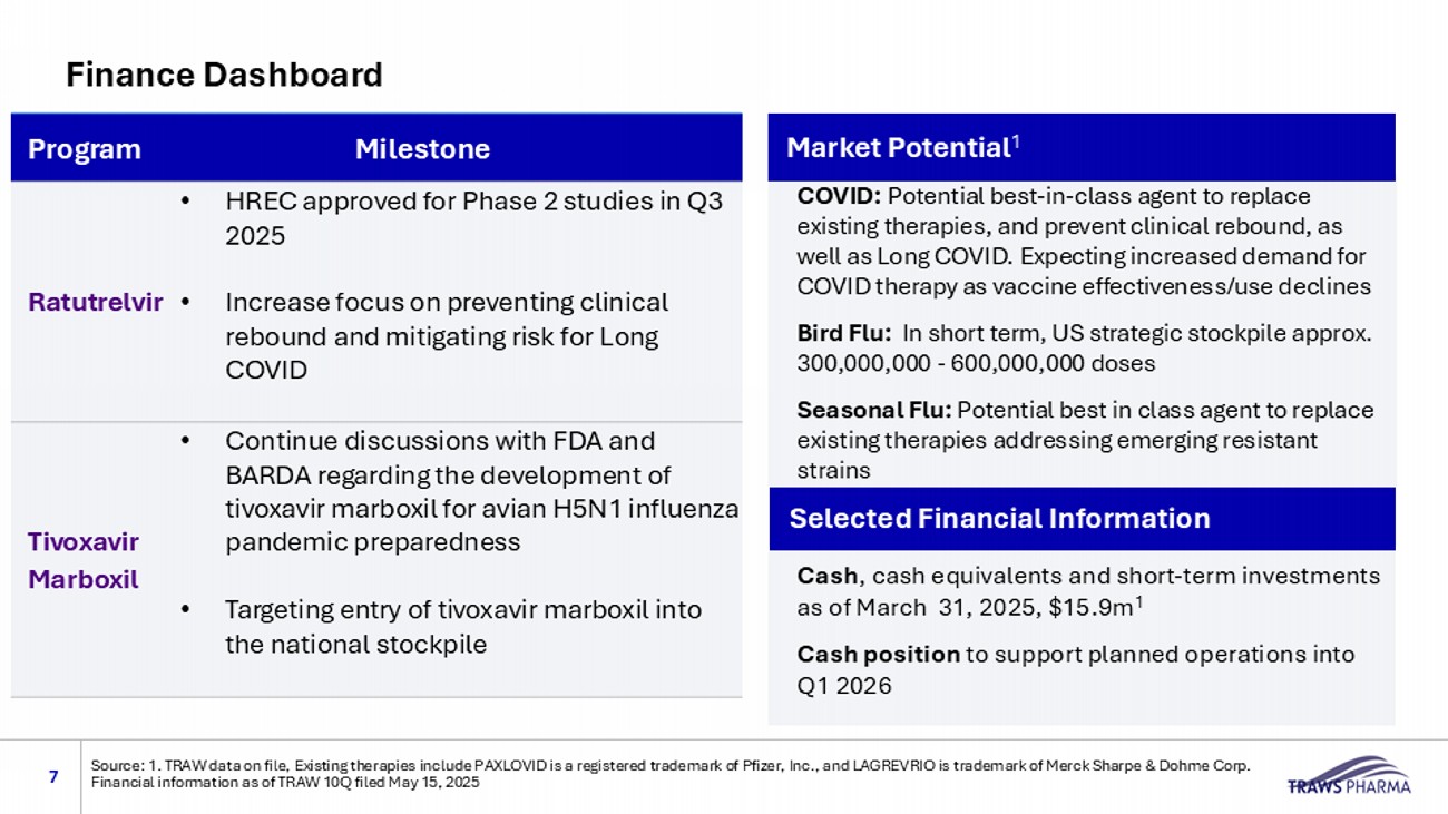Key Program Highlights 6 Source: TRAW data on file. Notes: PK = pharmacokinetics. PAXLOVID® is a registered trademark of Pfizer, Inc. Tamiflu® is a tr ade mark registered of Roche. Xofluza ® is a registered trademark of Genentech Pharmaceuticals COVID - Ratutrelvir Broad potency against many viral strains, including strains resistant to Tamiflu® and Xofluza ® Positive data from 3 animal models commonly used to assess bird - flu confirm drug activity One dose of TXM showed favorable Phase 1 PK with plasma blood levels > EC 90 for ~3 weeks with good safety Single dose therapy suitable for bird flu or seasonal flu treatment or prophylaxis; strong candidate for inclusion in strategic stockpile for pandemic preparedness Seeking accelerated approval for bird flu under the FDA Animal Rule; detailed feedback on path forward for bird and seasonal flu received from the FDA and discussions continue Potent across many SARS - CoV2 viral strains, with superior in vitro suppression of COVID versus benchmarks and emerging drug candidates Ritonavir - independent regimen mitigates patient exclusion due to drug - drug interactions, providing access to protease inhibitor therapy for patients who cannot take PAXLOVID® Single, daily dose showed favorable Phase 1 PK with good safety supporting a proposed 10 - day dose regimen The 10 - day dosing regimen (compared to 5 - day PAXLOVID® ) has the potential to prevent both COVID - rebound and Long COVID H5N1 Bird Flu – Tivoxavir marboxil