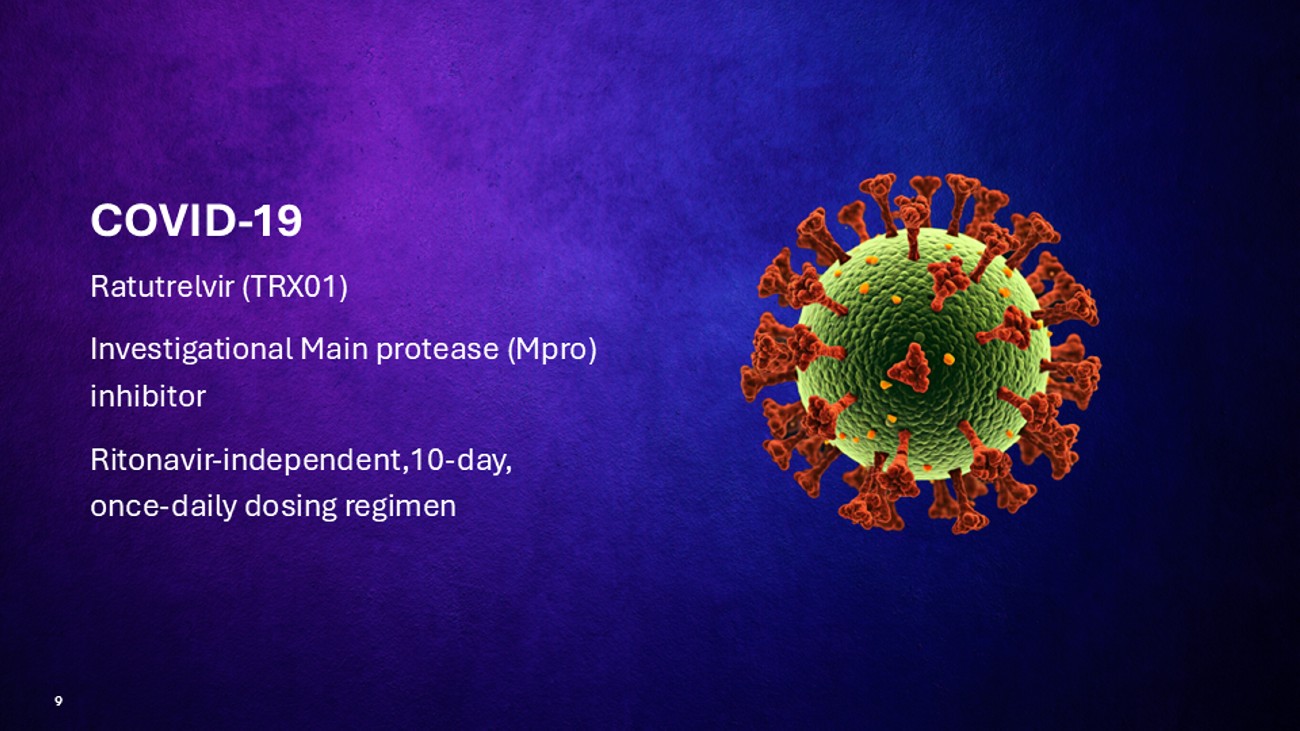 9 COVID - 19 Ratutrelvir (TRX01) Investigational Main protease ( Mpro ) inhibitor Ritonavir - independent,10 - day, once - daily dosing regimen