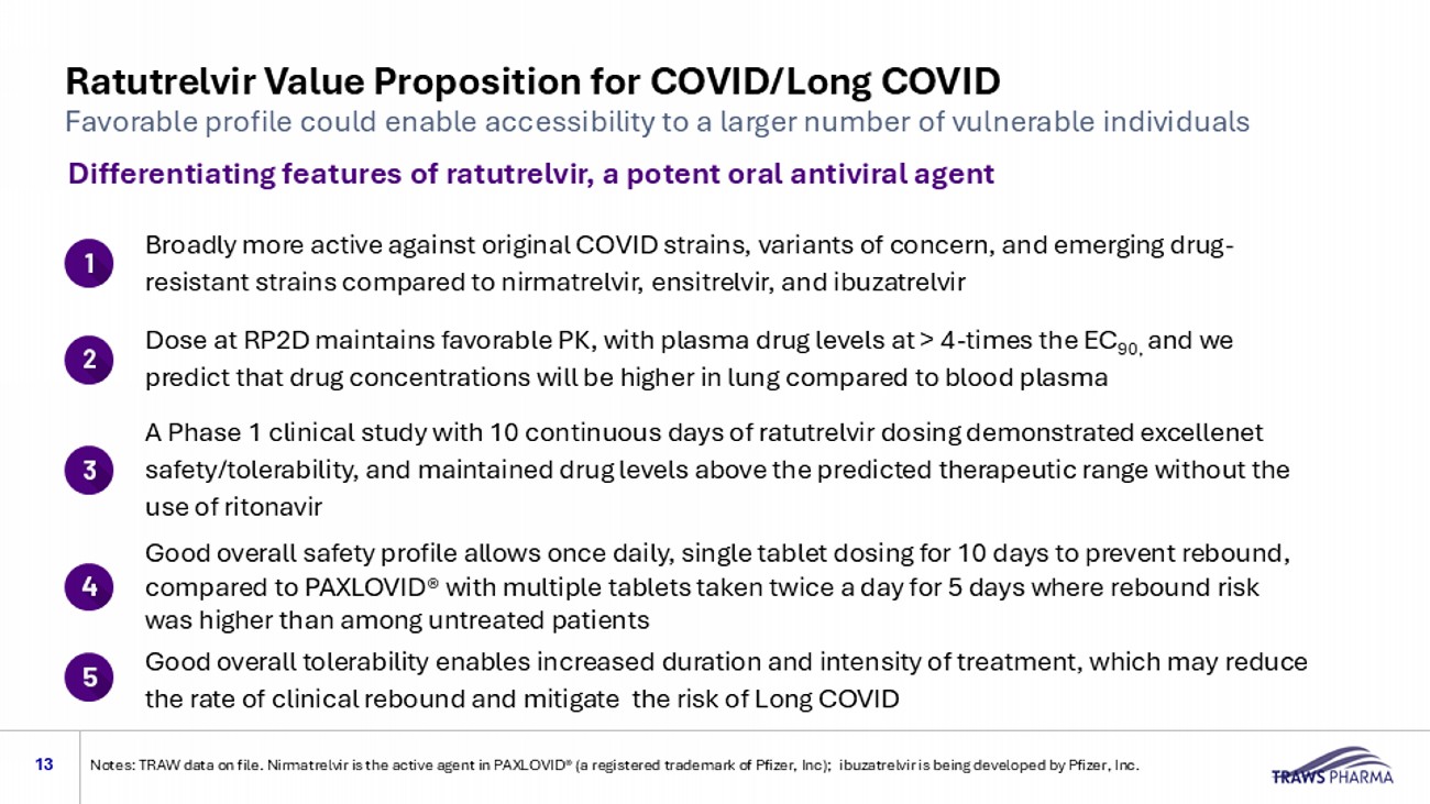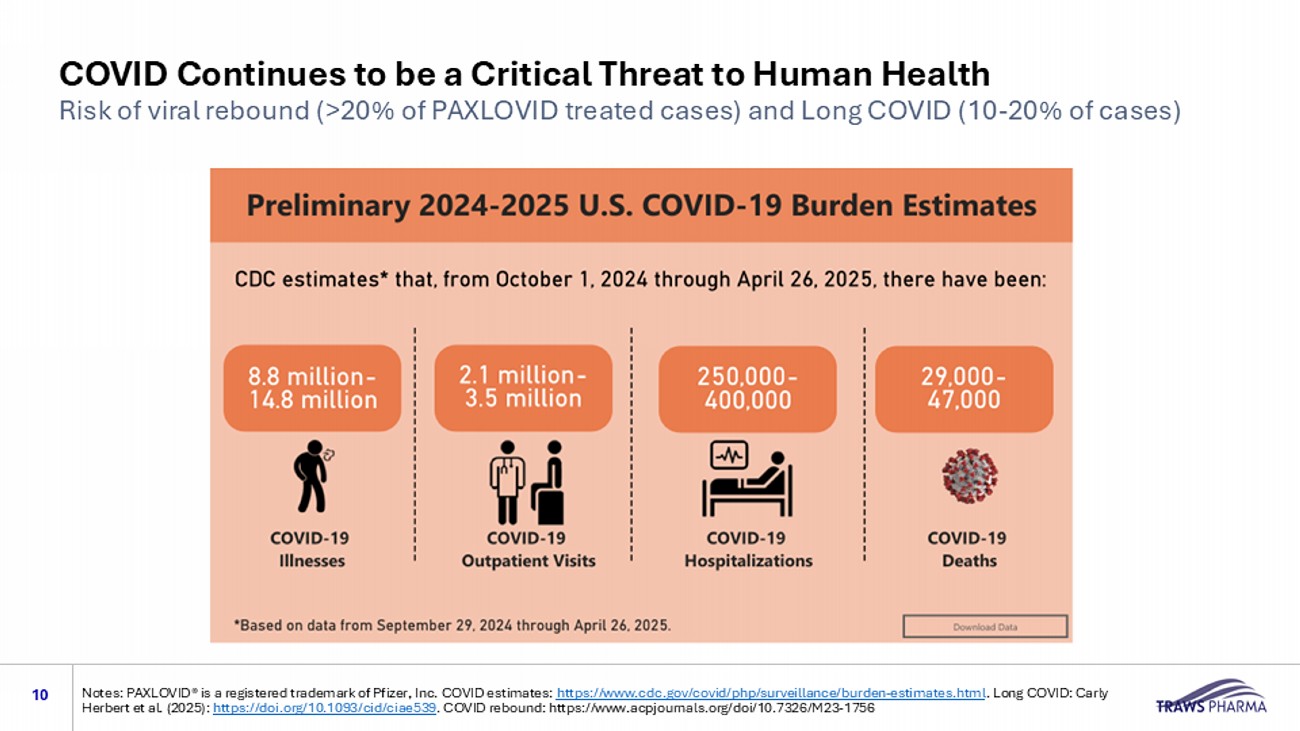 Why Improving COVID Therapy Matters Significant cause of human disease and mortality in vulnerable populations 1 12 Increasing clinical and economic burden of Long COVID Many people seeking COVID19 therapy are ineligible for PAXLOVID® due to drug interactions of the boosting agent ritonavir. Estimated that ~20% of persons seeking treatment are denied because they are using common medications that are incompatible with ritonavir Declining vaccine use, regulatory hurdles slowing vaccine approval, and poor match of vaccine with current variants increases virus spread and potential for serious disease Approved PAXLOVID® label limited to 5 - days, which may be insufficient to prevent clinical rebound and Long COVID Sources and Notes: 1. Traws information, 2. Carly Herbert et al. (2025) Clinical Infectious Diseases. https://doi.org/10.1093/cid/ciae539 . PAXLOVID® is a registered trademark of Pfizer, Inc COVID is now established as a long - term public health challenge with an increasing burden of people suffering from Post - Acute Sequelae of COVID (PASC, aka Long COVID) 2