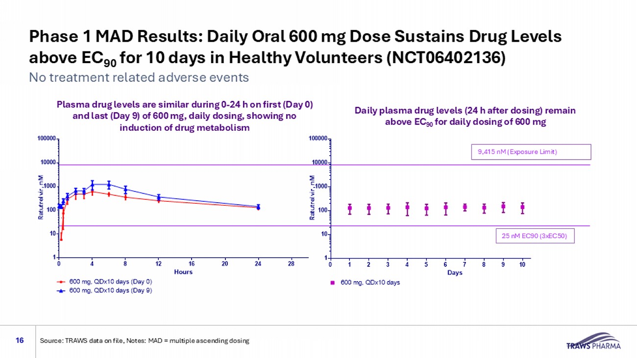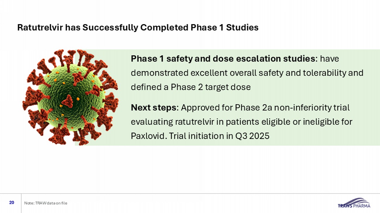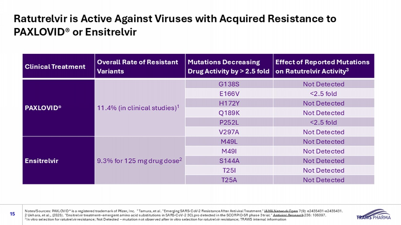 Ratutrelvir is Active Against Viruses with Acquired Resistance to PAXLOVID® or Ensitrelvir 15 Notes/Sources: PAXLOVID® is a registered trademark of Pfizer, Inc. 1 Tamura, et al. "Emerging SARS - CoV - 2 Resistance After Antiviral Treatment." JAMA Network Open 7(9): e2435431 - e2435431. 2 Uehara, et al., (2025). " Ensitrelvir treatment – emergent amino acid substitutions in SARS - CoV - 2 3CLpro detected in the SCORPIO - SR phase 3 trial." Antiviral Research 236: 106097. 3 In vitro selection for ratutrelvir resistance; Not Detected – mutation not observed after in vitro selection for ratutrelvir resistance; TRAWS internal information Effect of Reported Mutations on Ratutrelvir Activity 3 Mutations Decreasing Drug Activity by > 2.5 fold Overall Rate of Resistant Variants Clinical Treatment Not Detected G138S 11.4% (in clinical studies) 1 PAXLOVID® <2.5 fold E166V Not Detected H172Y Not Detected Q189K <2.5 fold P252L Not Detected V297A Not Detected M49L 9.3% for 125 mg drug dose 2 Ensitrelvir Not Detected M49I Not Detected S144A Not Detected T25I Not Detected T25A