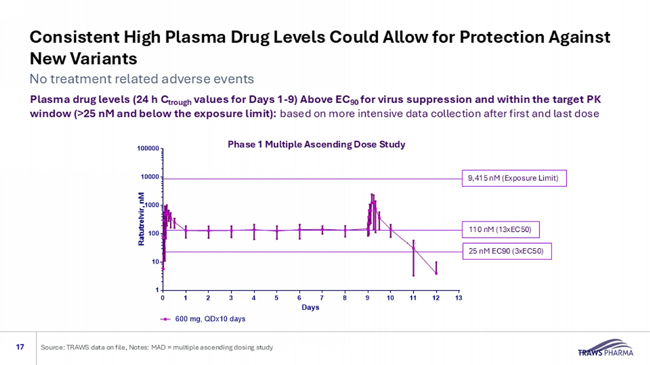 Phase 1 MAD Results: Daily Oral 600 mg Dose Sustains Drug Levels above EC 90 for 10 days in Healthy Volunteers (NCT06402136) 16 No treatment related adverse events Source: TRAWS data on file, Notes: MAD = multiple ascending dosing 9,415 nM (Exposure Limit) 25 nM EC90 (3xEC50) Multiple Ascending Doses in human trough concentrations 0 1 2 3 4 5 6 7 8 9 10 11 12 13 1 10 100 1000 10000 100000 Days R a t u t r e l v i r , n M 48 nM 600 mg, QDx10 days Multiple Ascending Doses in human 0 4 8 12 16 20 24 28 1 10 100 1000 10000 100000 Hours R a t u t r e l v i r , n M 48 nM 600 mg, QDx10 days (Day 0) 600 mg, QDx10 days (Day 9) Plasma drug levels are similar during 0 - 24 h on first (Day 0) and last (Day 9) of 600 mg, daily dosing, showing no induction of drug metabolism Daily plasma drug levels (24 h after dosing) remain above EC 90 for daily dosing of 600 mg