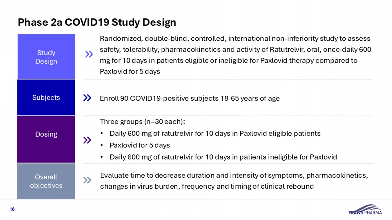 Consistent High Plasma Drug Levels Could Allow for Protection Against New Variants 17 No treatment related adverse events Source: TRAWS data on file, Notes: MAD = multiple ascending dosing study 9,415 nM (Exposure Limit) 25 nM EC90 (3xEC50) Multiple Ascending Doses in human 0 1 2 3 4 5 6 7 8 9 10 11 12 13 1 10 100 1000 10000 100000 Days R a t u t r e l v i r , n M 48 nM 600 mg, QDx10 days 110 nM (13xEC50) Plasma drug l evels (24 h C trough values for Days 1 - 9) Above EC 90 for virus suppression and within the target PK window (>25 nM and below the exposure limit): based on more intensive data collection after first and last dose Phase 1 Multiple Ascending Dose Study