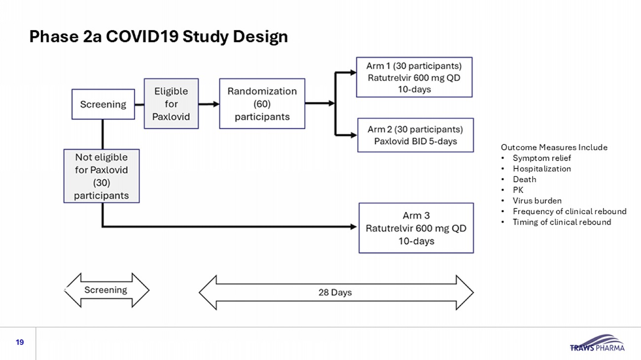 Phase 2a COVID19 Study Design 18 Enroll 90 COVID19 - positive subjects 18 - 65 years of age Three groups (n=30 each): • Daily 600 mg of ratutrelvir for 10 days in Paxlovid eligible patients • Paxlovid for 5 days • Daily 600 mg of ratutrelvir for 10 days in patients ineligible for Paxlovid Evaluate time to decrease duration and intensity of symptoms, pharmacokinetics, changes in virus burden, frequency and timing of clinical rebound Randomized, double - blind, controlled, international non - inferiority study to assess safety, tolerability, pharmacokinetics and activity of Ratutrelvir, oral, once - daily 600 mg for 10 days in patients eligible or ineligible for Paxlovid therapy compared to Paxlovid for 5 days Study Design Subjects Overall objectives Dosing