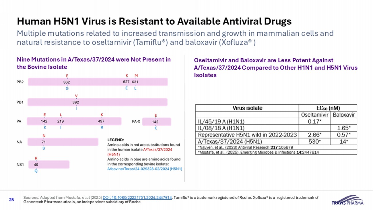 Human H5N1 Virus is Resistant to Available Antiviral Drugs Multiple mutations related to increased transmission and growth in mammalian cells and natural resistance to oseltamivir (Tamiflu®) and baloxavir ( Xofluza ® ) 25 Nine Mutations in A/Texas/37/2024 were Not Present in the Bovine Isolate Oseltamivir and Baloxavir are Less Potent Against A/Texas/37/2024 Compared to Other H1N1 and H5N1 Virus Isolates Sources: Adapted from Mostafa, et al (2025) DOI: 10.1080/22221751.2024.2447614 . Tamiflu® is a trademark registered of Roche. Xofluza ® is a registered trademark of Genentech Pharmaceuticals, an independent subsidiary of Roche