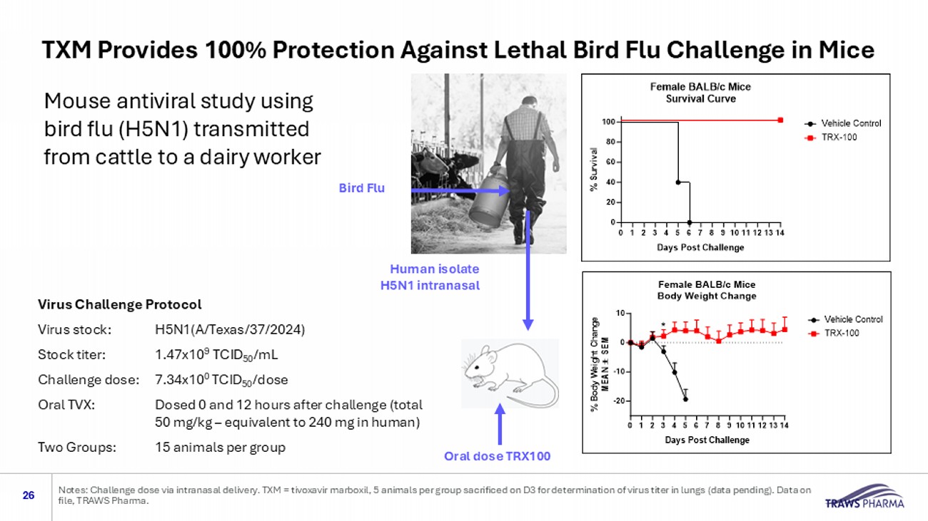 Tivoxavir Marboxil (TRX100/TXM): Value Proposition for Bird Flu 23 Differentiating features of TXM, a potent oral antiviral drug candidate A single dose reduced disease and prevented death in 3 preclinical animal models used commonly in flu drug development, with large reductions in lun g virus levels and lung pathology A singl e dose maintained plasma levels above the EC 90 for approximately 3 weeks in Phase 1 human studies 4 5 Broadly effective against bird flu strains including “Texas dairy worker strain”, demonstrated through in vivo studies Large safety window enables use of higher TXM doses, if needed to treat future emergent resistant strains