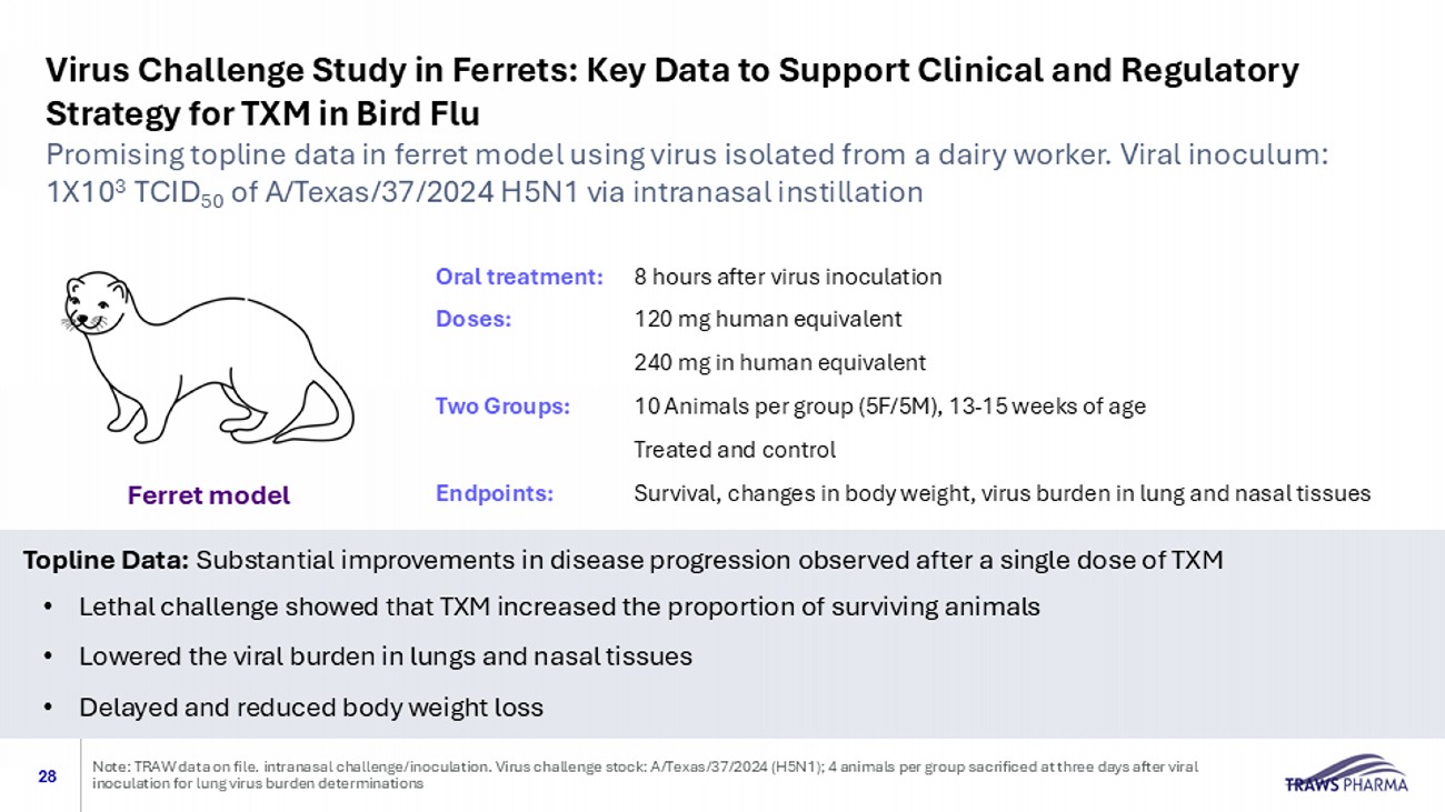 Virus Challenge Study in Ferrets: Key Data to Support Clinical and Regulatory Strategy for TXM in Bird Flu 28 Note: TRAW data on file. intranasal challenge/inoculation. Virus challenge stock: A/Texas/37/2024 (H5N1); 4 animals per group sa crificed at three days after viral inoculation for lung virus burden determinations Oral treatment: 8 hours after virus inoculation Doses: 120 mg human equivalent 240 mg in human equivalent Two Groups: 10 Animals per group (5F/5M), 13 - 15 weeks of age Treated and control Endpoints: Survival, changes in body weight, virus burden in lung and nasal tissues Topline Data: Substantial improvements in disease progression observed after a single dose of TXM • Lethal challenge showed that TXM increased the proportion of surviving animals • Lowered the viral burden in lungs and nasal tissues • Delayed and reduced body weight loss Promising topline data in ferret model using virus isolated from a dairy worker. Viral inoculum: 1X10 3 TCID 50 of A/Texas/37/2024 H5N1 via intranasal instillation Ferret model